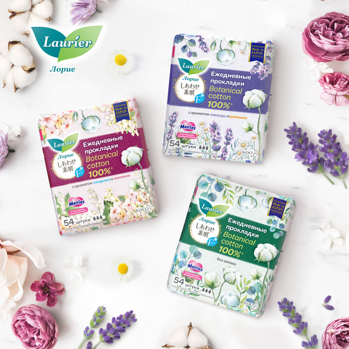 Прокладки ежедневные Laurier Botanical Cotton, c ароматом Лаванды и Ромашки, 54 шт