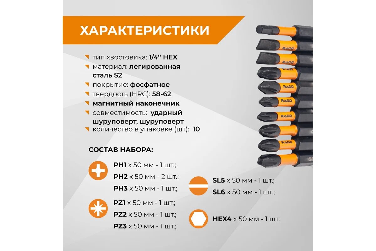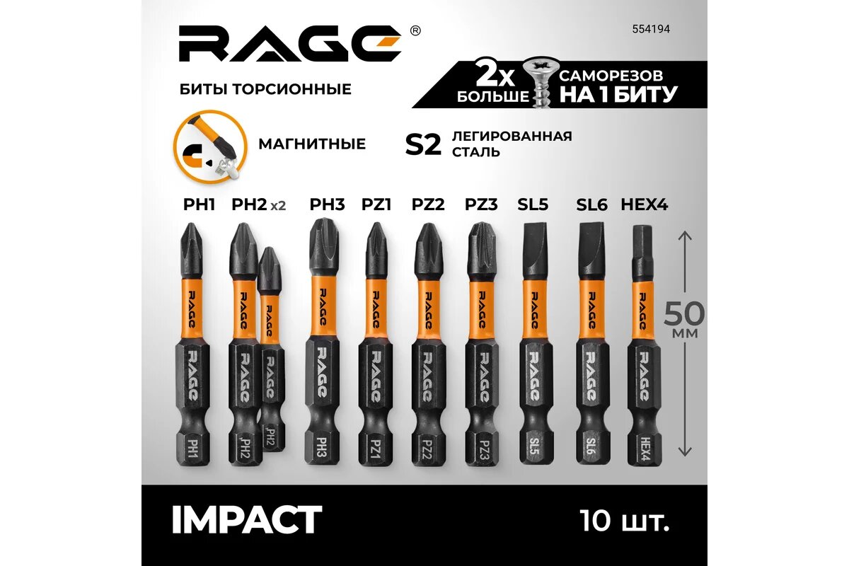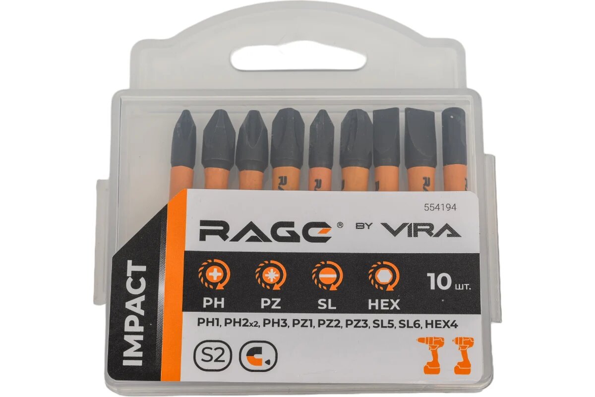Набор бит ударных IMPACT S2, PH, PZ, SL, HEX x 50 мм, 10 шт RAGE By VIRA 554194 интересное: