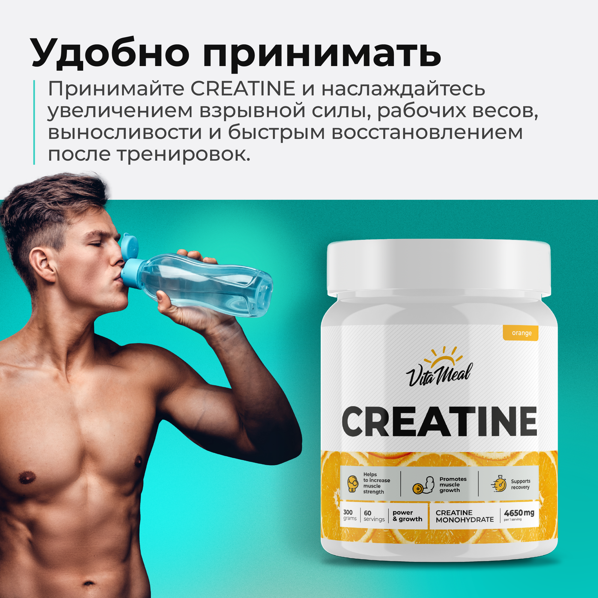 Креатин моногидрат порошок Creatine Monohydrate VitaMeal 300 г, Апельсин