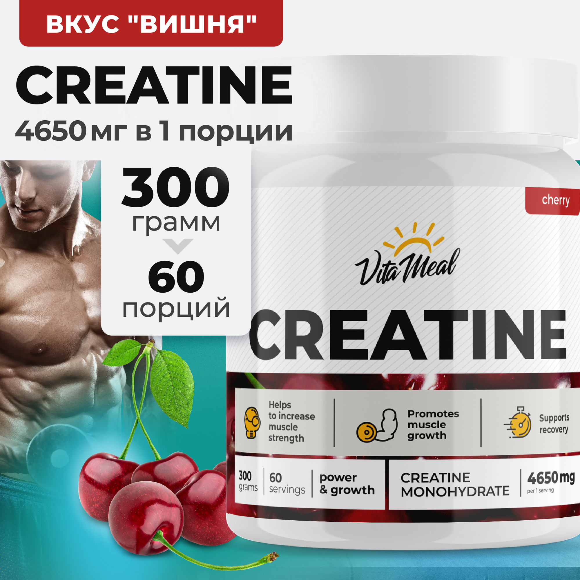Креатин моногидрат порошок Creatine Monohydrate VitaMeal 300 г, Вишня