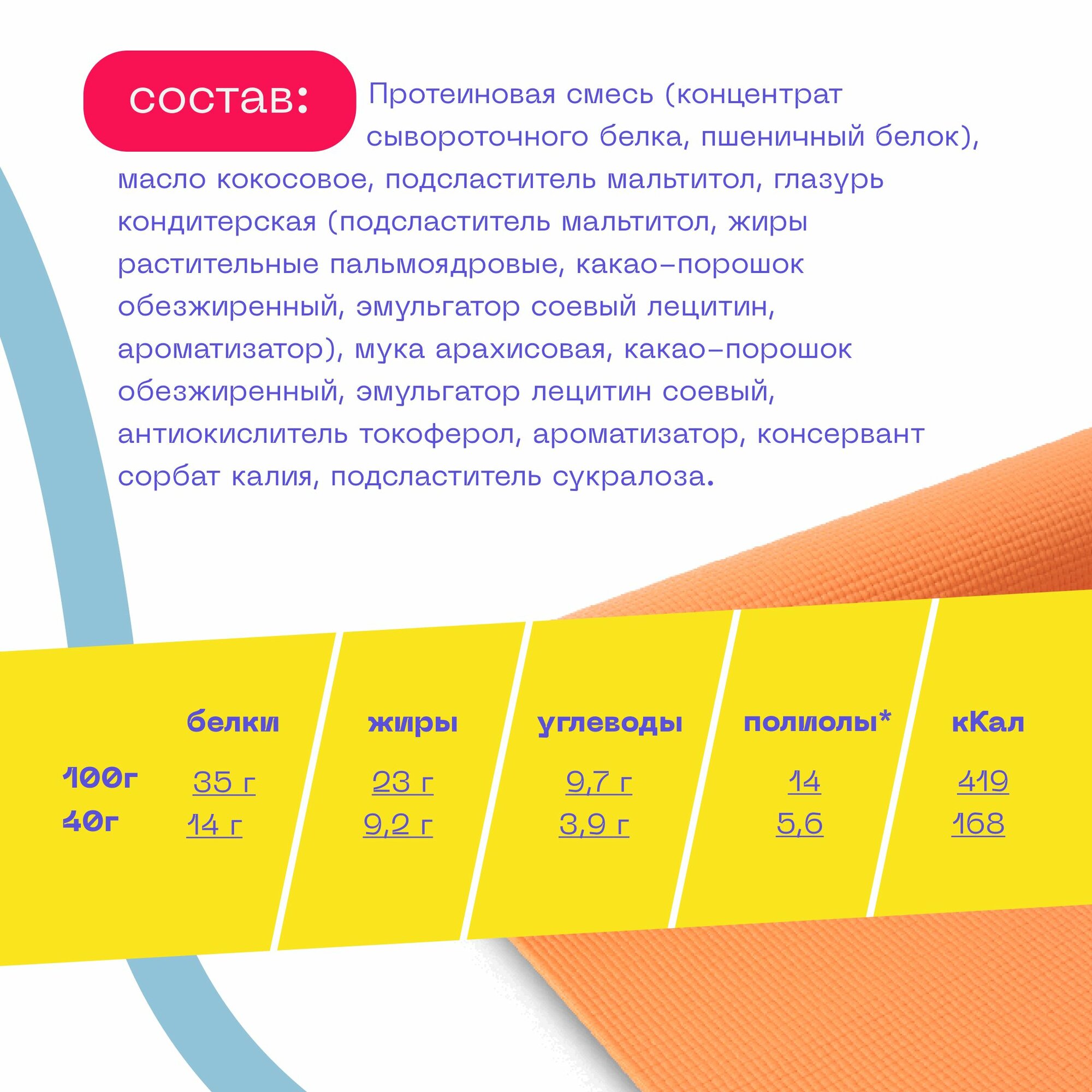 | Дополнительная информация | "Состав: Протеиновая смесь (концентрат сывороточного белка, пшеничный белок), масло кокосовое, подсластитель мальтитол, мука арахисовая, эмульгатор лецитин соевый, антиокислитель токоферол, ароматизатор, консервант сорбат калия, подсластитель сукралоза.Пищевая и энергетическая ценность на 100г: Белки 35г, жиры 23г, углеводы 9,7г, полиолы 14г, 419 ккал/1754 кДж/ на порцию: Белки 14г, жиры 9,2г, углеводы 3,9г, полиолы 5,6г, 168 ккал/703 кДж. Способ применения: Это печенье отлично разнообразит ваш рацион. 2 штуки в день заменят один прием пищи и обеспечат до 30% дневной потребности в белке* (*в зависимости от индивидуальных параметров)" |
