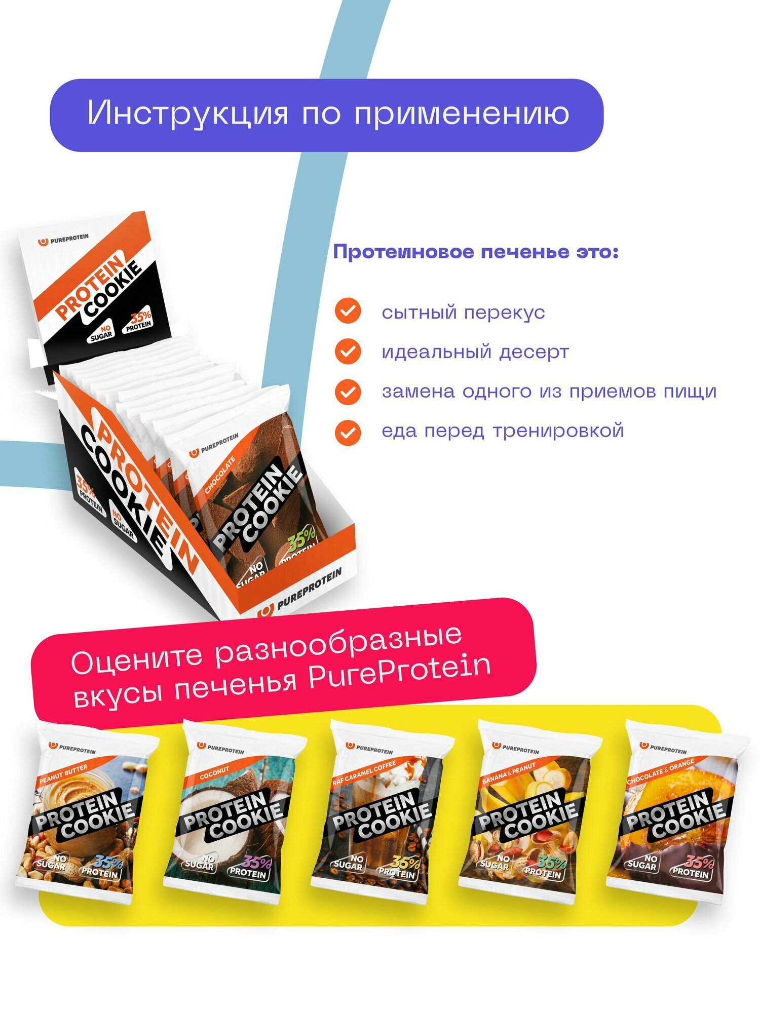 Протеиновое печенье Pureprotein Protein Cookie с высоким содержанием белка вкус ассорти Арахисовое масло Банан и Арахис Кокос Раф Карамель Шоколад Апельсин Шоколад 14шт*40г