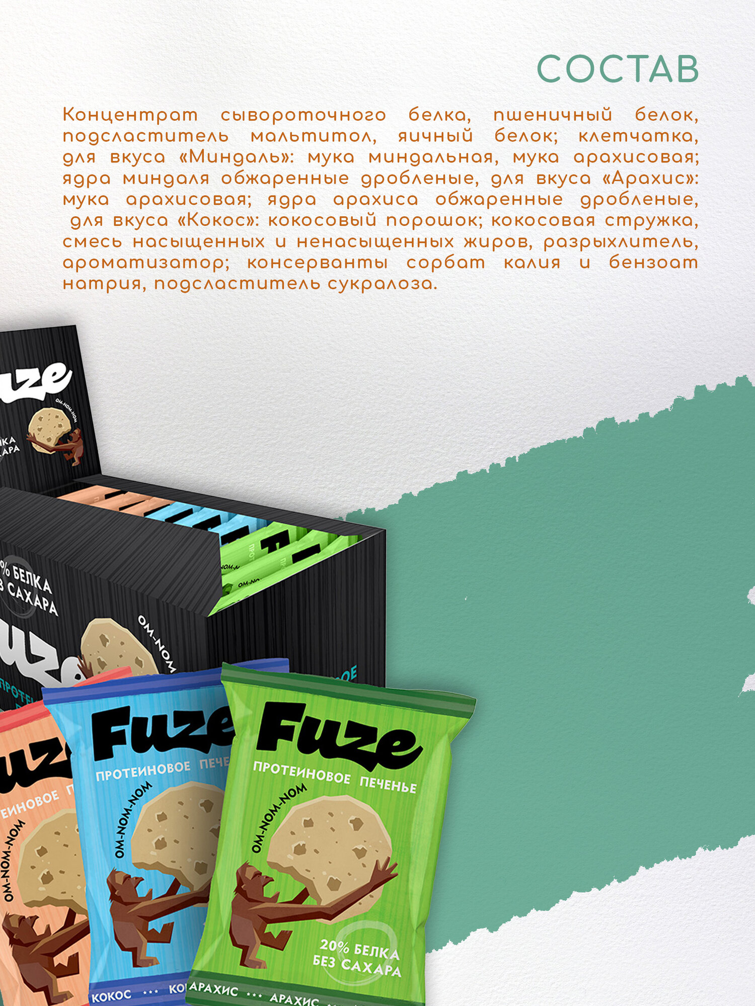 Купить Печенье протеиновое FUZE без сахара, миндаль, арахис, кокос, 9шт х 40г