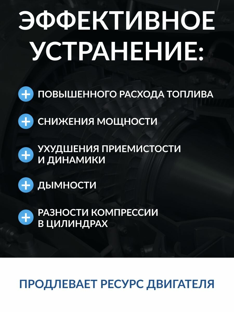 | Действие | защита двигателя при "холодном" пуске / очищение деталей двигателя / очищение системы впуска / очищение топливной системы / снижение расхода масла / снижение расхода топлива / увеличение мощности двигателя / увеличение ресурса двигателя |