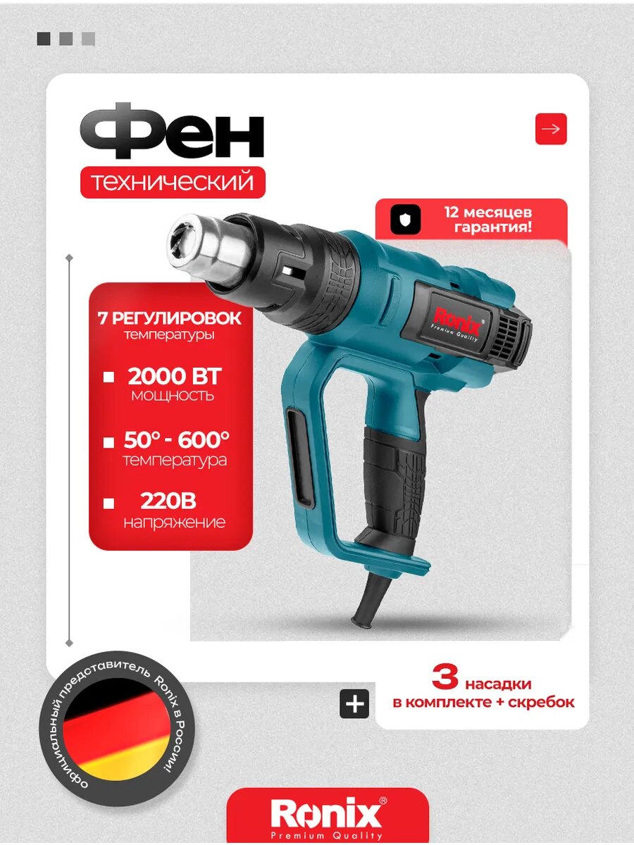 Фен строительный Ronix с регулировкой температуры до 600°мощность 2000 Вт интересное: