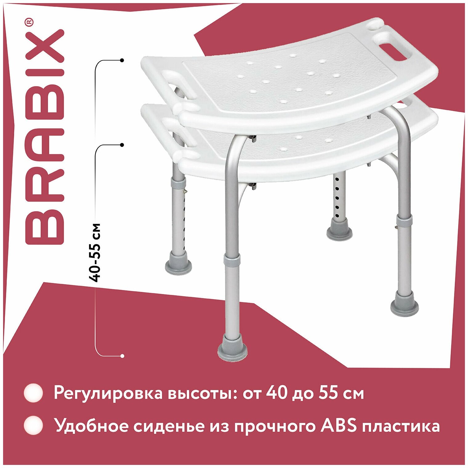 Стул-сиденье прямоугольный Brabix купание в душе и ванной, регулировка высоты ножек, любой рост