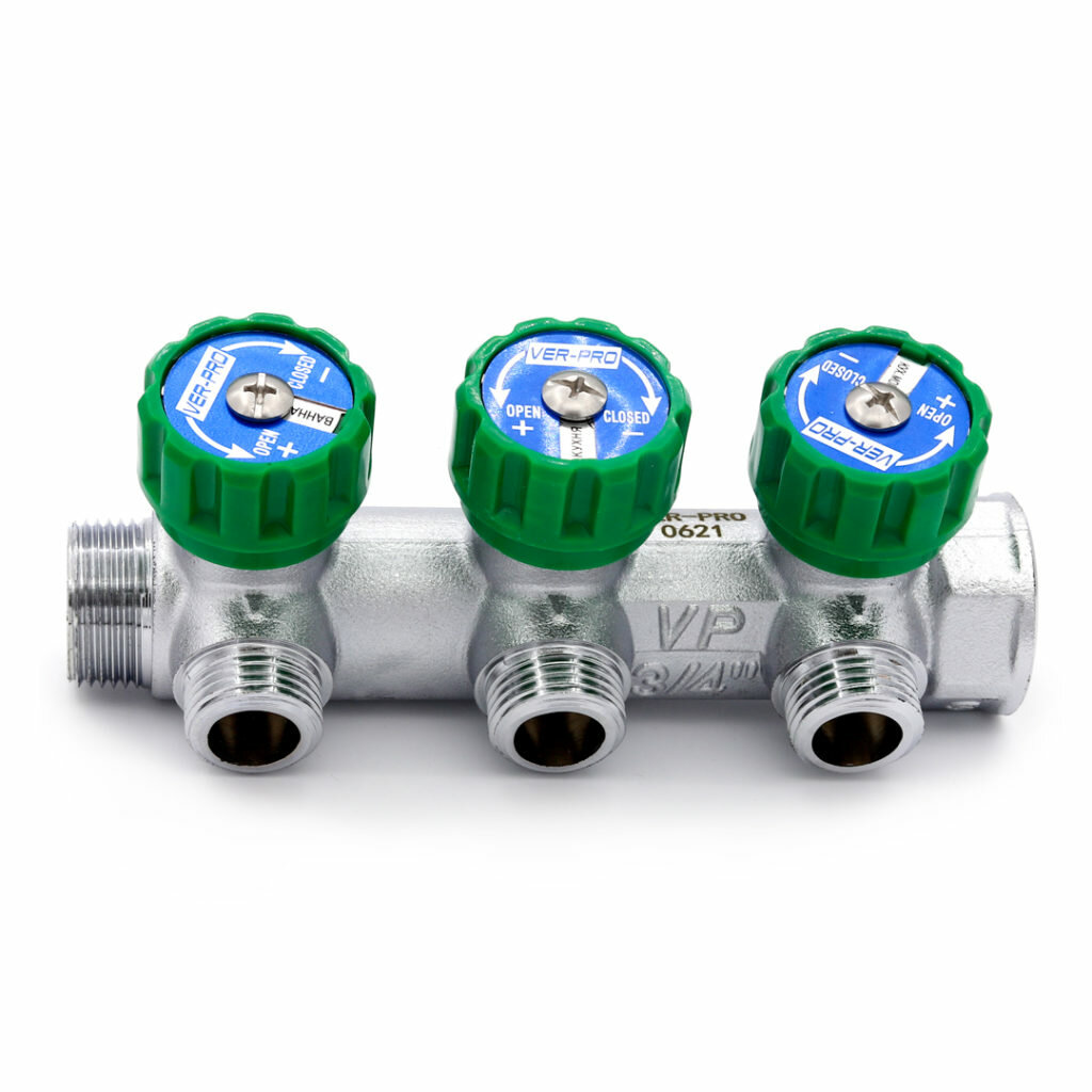 Купить Коллектор 3/4"х1/2"НР - 3 выхода плоский с регулировочными вентилями для водоснабжения хром VER403-A