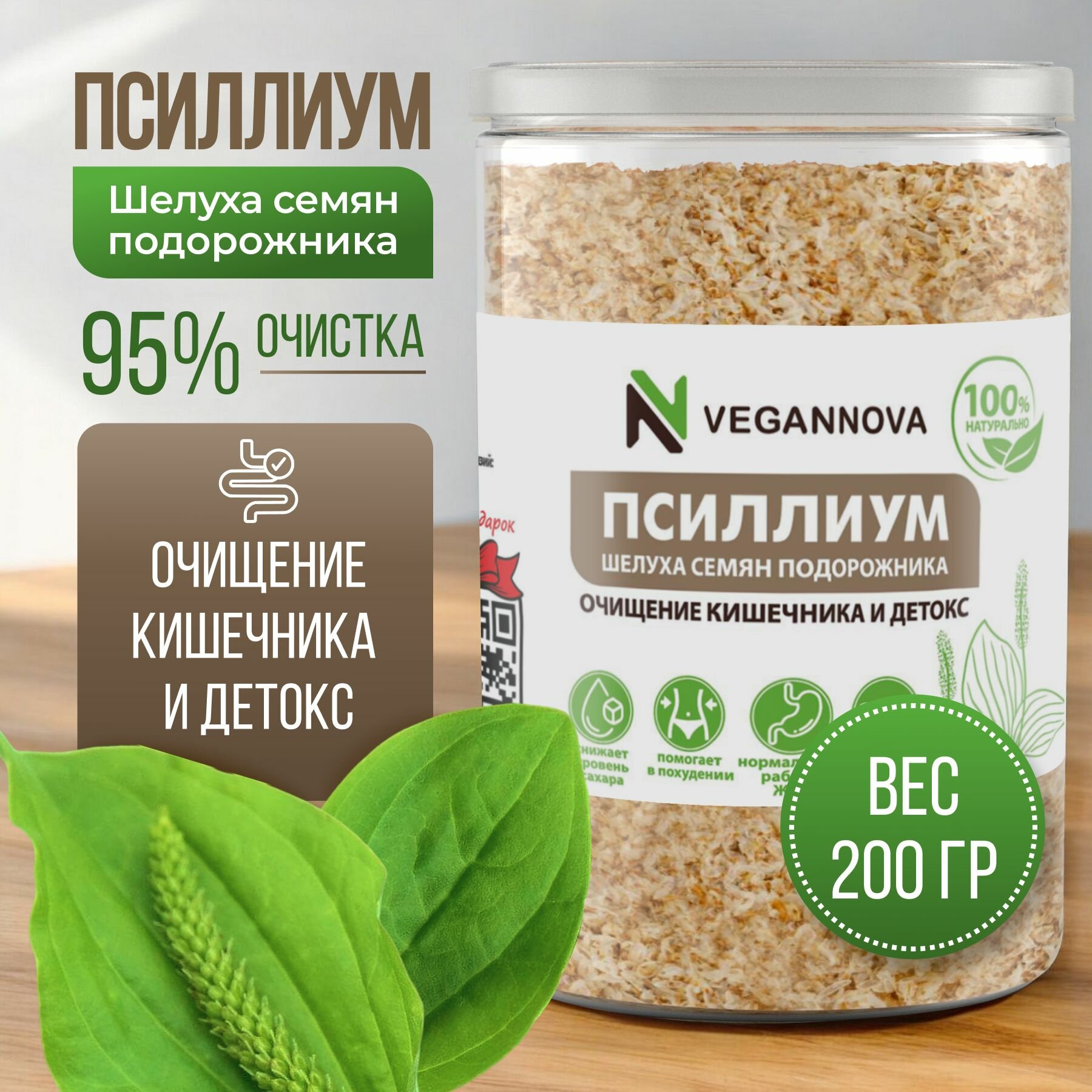 VeganNova Псиллиум (шелуха семени подорожника) очищающий, для похудения, 85% клетчатки, банка 200 г