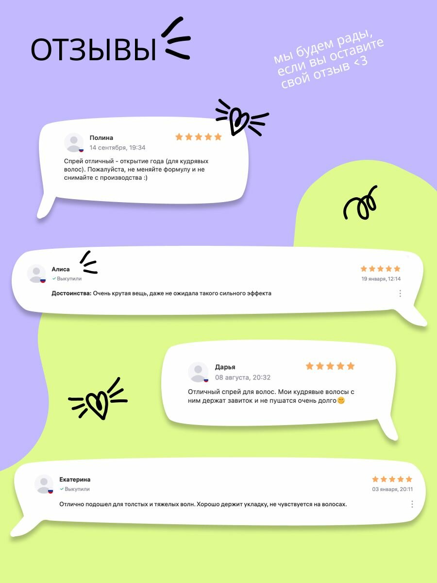 | Способ применения | Равномерно распылить спрей на расстоянии 20-30 см на влажные или сухие волосы и придать желаемую форму прядям. Высушить пряди естественным способом или при помощи фена с диффузором, придав волосам легкую небрежность. При попадании в глаза тщательно промыть их водой. |