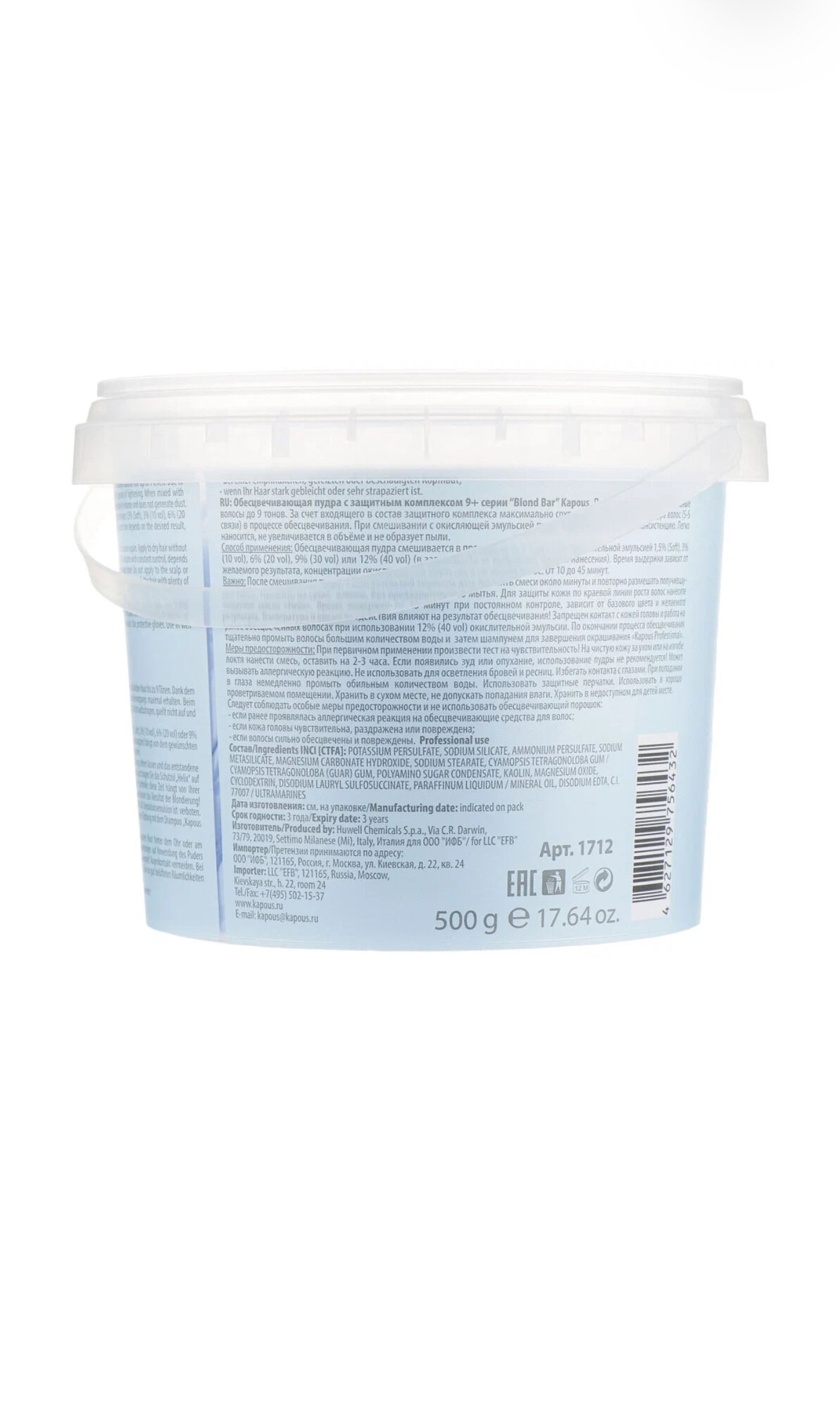 | Способ применения | Провести диагностику волос и кожи головы. В неметаллической ёмкости смешать обесцвечивающую пудру с окислительной эмульсией «Blond Cremoxon» 1,5% (5vol), 3% (10vol), 6% (20vol) − для всех видов работ, 9% (30vol) − без контакта с кожей головы в пропорции 1:2 (35 г пудры + 70 г окислительной эмульсии) до однородной консистенции. После смешивания пудры и окислителя дать постоять смеси около 1 минуты и повторно размешать. Наносить на сухие волосы без предварительного мытья. Время выдержки до 50 минут. По окончании времени выдержки тщательно смыть обесцвечивающую смесь обильным количеством воды. Для завершения обесцвечивания использовать шампунь и бальзам для завершения окрашивания Kapous. |
