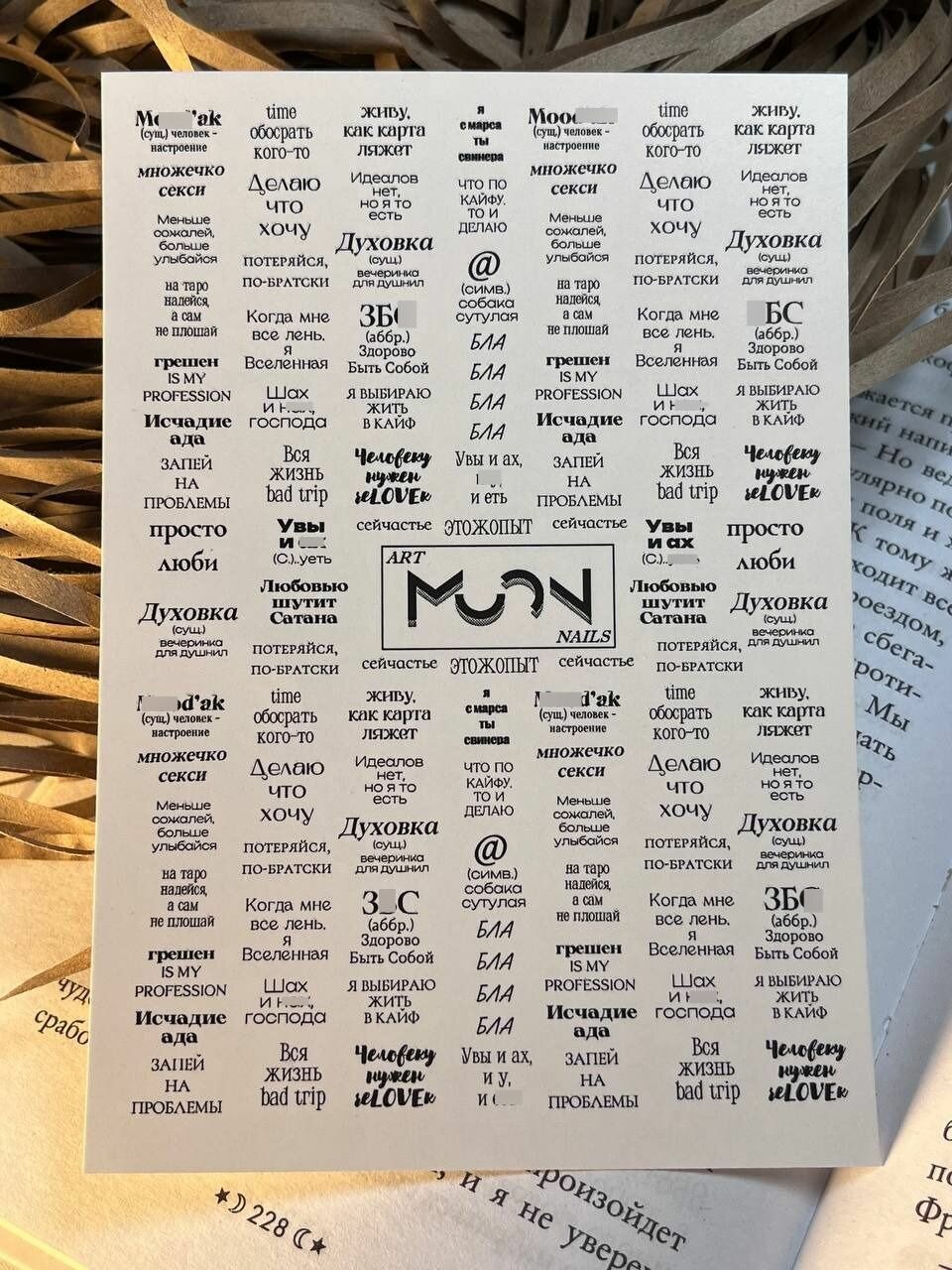 Набор слайдеров для маникюра MOON "Слова на английском и русском", черно-белые, 2 шт.