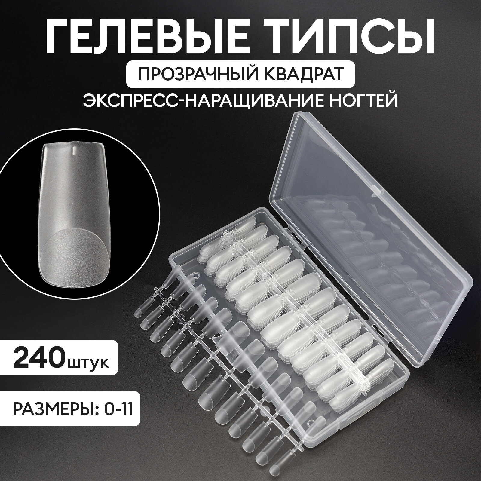 Гелевые типсы для экспресс наращивания натуральный квадрат (размеры 0-11), 240 шт. №7076