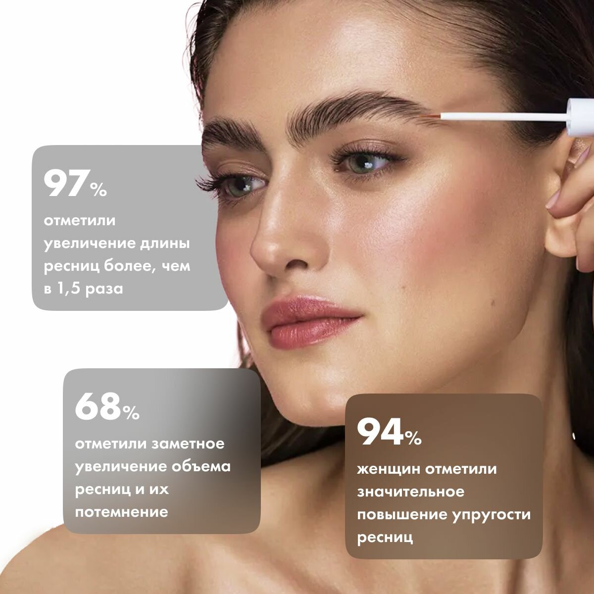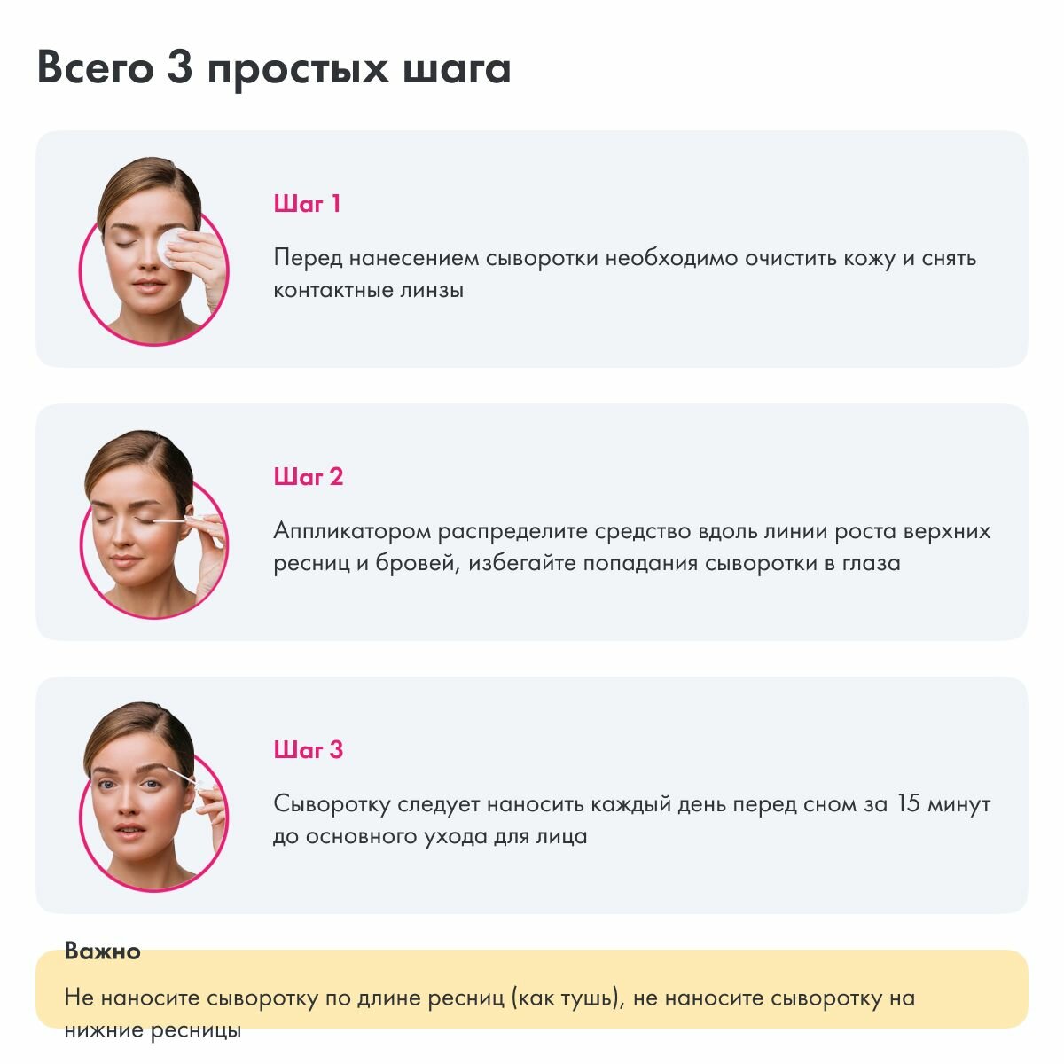 | Способ применения | 1. Удалите макияж специальным очищающим средством 2. Аппликатором тонко распределите средство вдоль верхних ресниц и бровей, избегайте попадания сыворотки в глаза 3. Наносите сыворотку каждый день перед сном, во время отдыха она равномерно распределяется по сомкнутым ресницам 4. Для закрепления эффекта, приобретенного за полный курс использования сыворотки, необходимо продолжать наносить ее 2−3 раза в неделю |