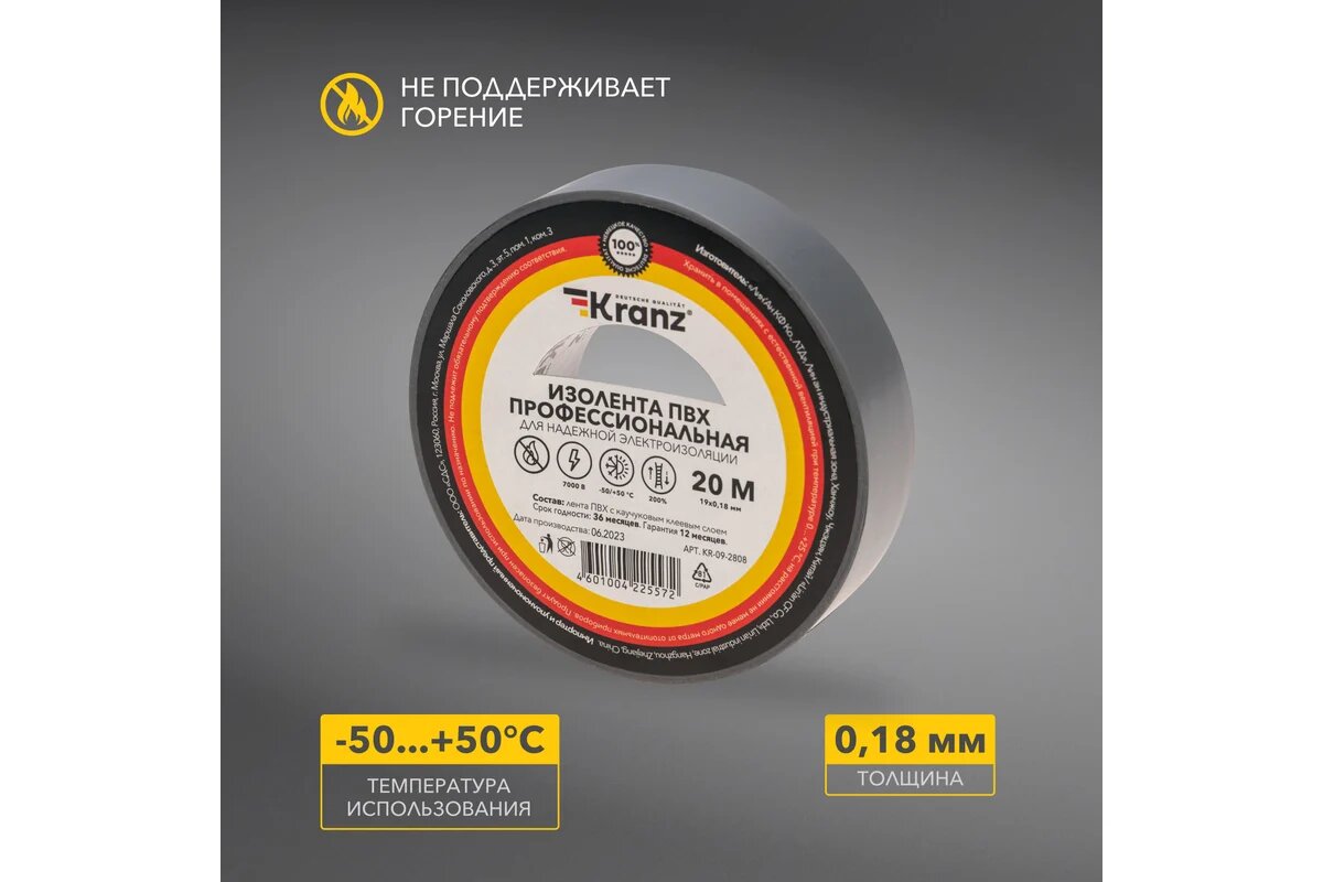Изолента ПВХ профессиональная 0.18х19мм 20м сер. Kranz KR-09-2808