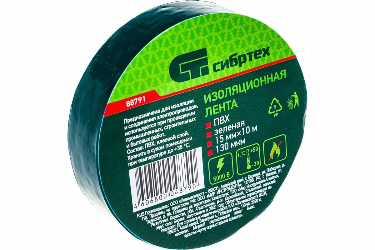 Изолента СИБРТЕХ ПВХ, 15 мм х 10 м, 130 мкм, зеленая ,8штук