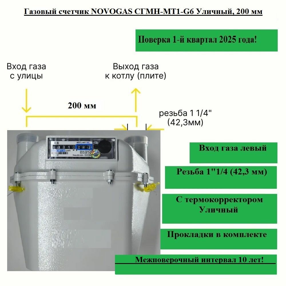 Газовый счетчик NOVOGAS СГМН-МТ1-G6 Уличный, 200 мм, Слева-направо; 2025 года выпуска и поверки. интересное: