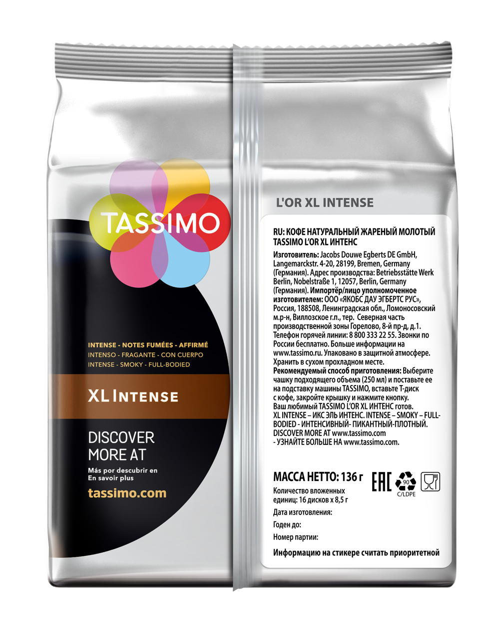 Кофе в капсулах Tassimo L’or Xl Intense, 16 порций, 136 г