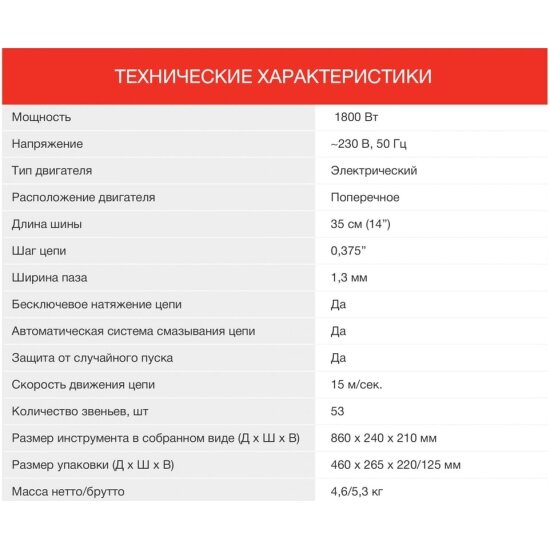 | Комплект поставки | Пила цепная электрическая, шина, кожух для шины, цепь, комплект крепежа, руководство пользователя с гарантийным талоном |
