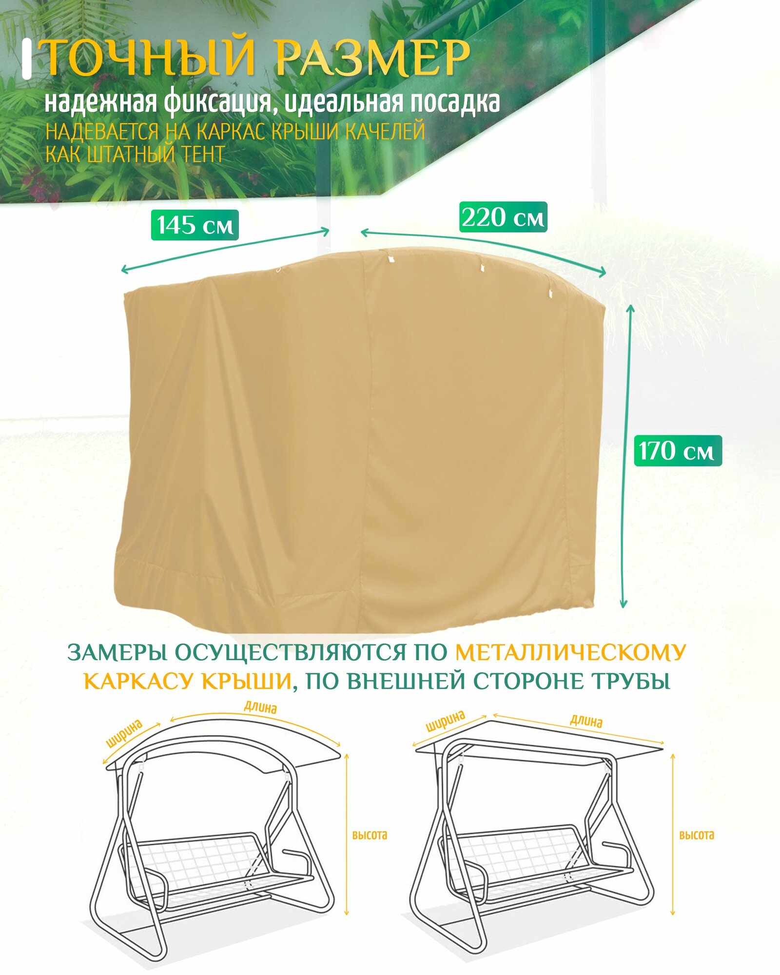 | Дополнительная информация | Укрывной чехол от дождя для садовых качелей из уплотненной водооталкивающей ткани Оксфорд 240D |