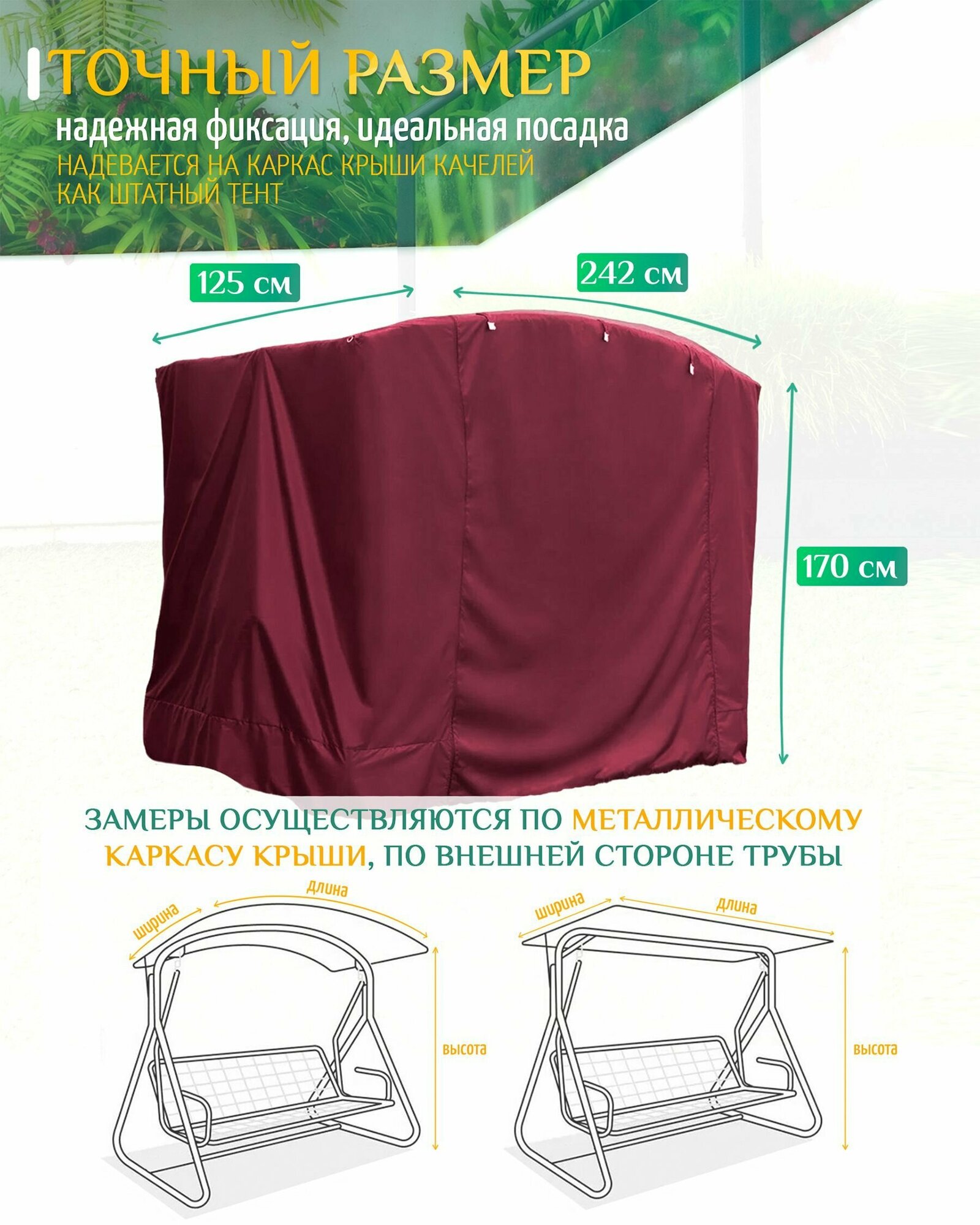 | Дополнительная информация | Укрывной чехол от дождя для садовых качелей из уплотненной водооталкивающей ткани Оксфорд 240D |