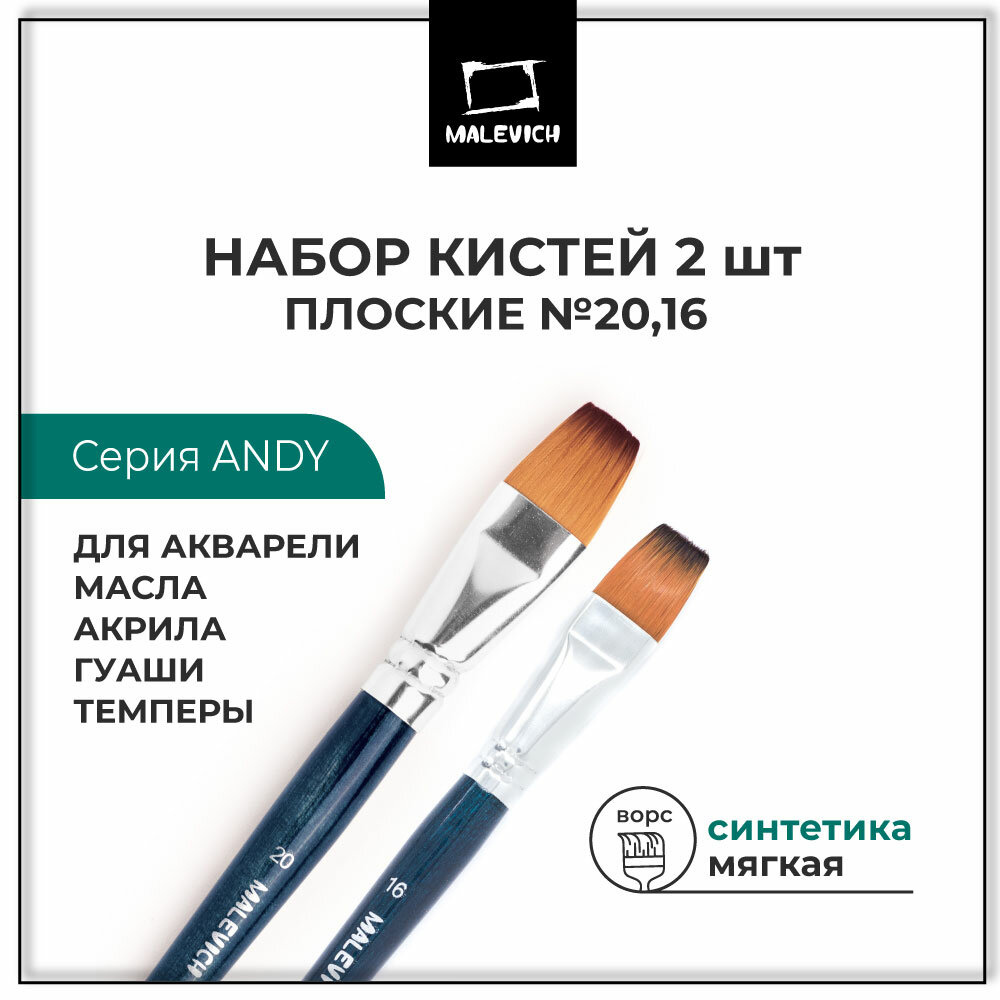 Купить Кисти для рисования из синтетики Andy Малевичъ, набор плоских кистей №16, 20