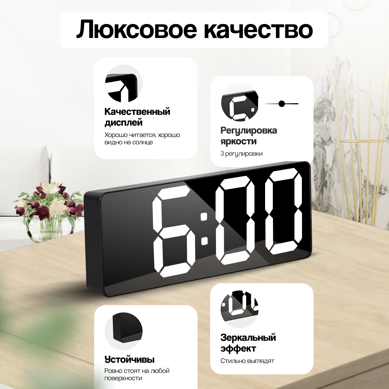 Часы настольные электронные на батарейках от сети, зеркальная поверхность, с белыми цифрами, декор для кухни и дома