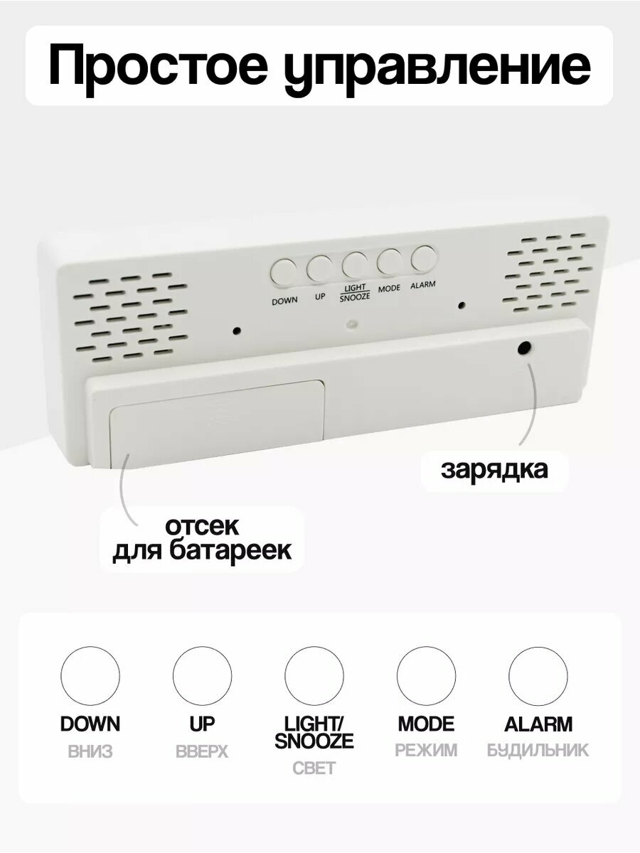 Часы настольные электронные с проекцией: будильник, термометр, календарь, 19.6 х 6.5 см