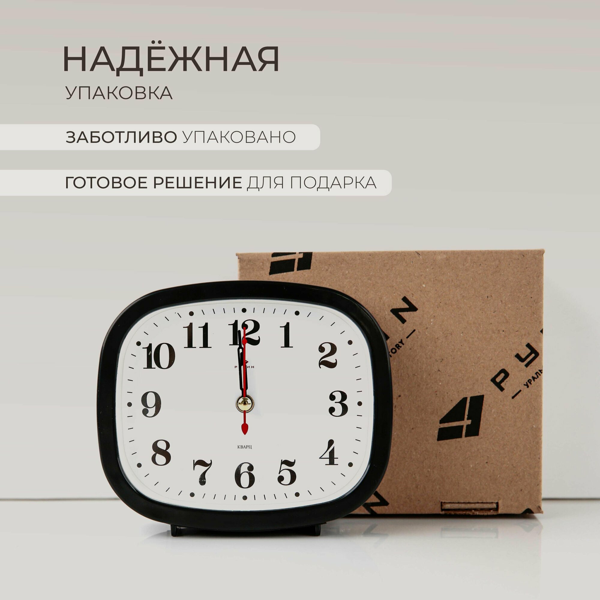 Будильник настольный Рубин Классика для спальни с арабскими цифрами, от пальчиковой батарейки АА, ширина 12.5 см высота 10.5 см