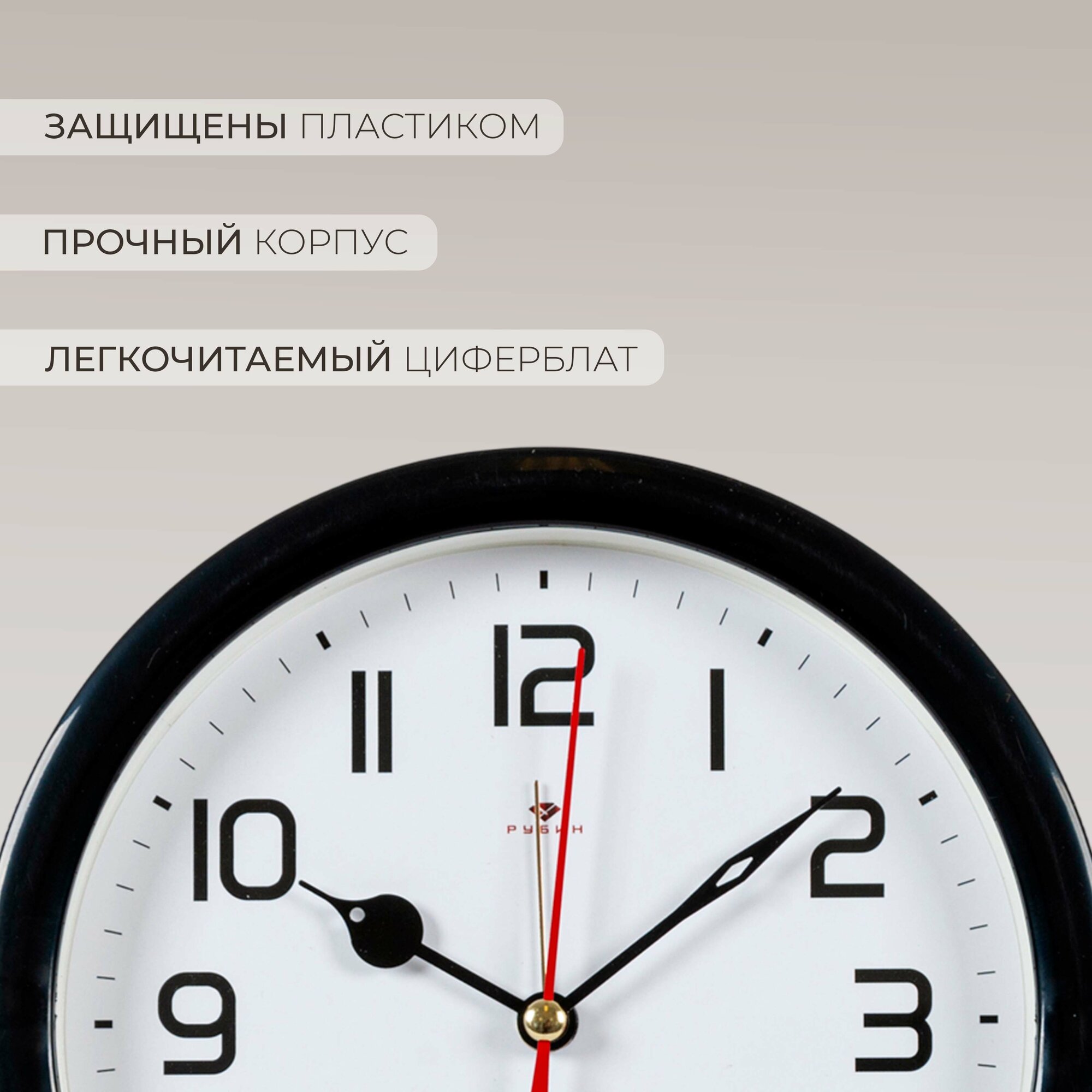 Часы-будильник кварцевые в современном стиле в форме круга Рубин Классика В5-001 с большими арабским цифрами для украшения интерьера гостиной, спальни, кухни или офиса