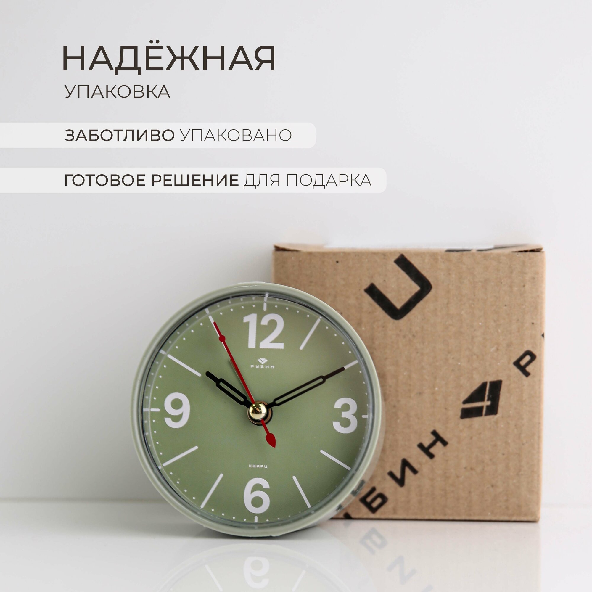 Будильник настольный Рубин Классика для спальни с арабскими цифрами, от пальчиковой батарейки АА, ширина 12.5 см высота 10.5 см