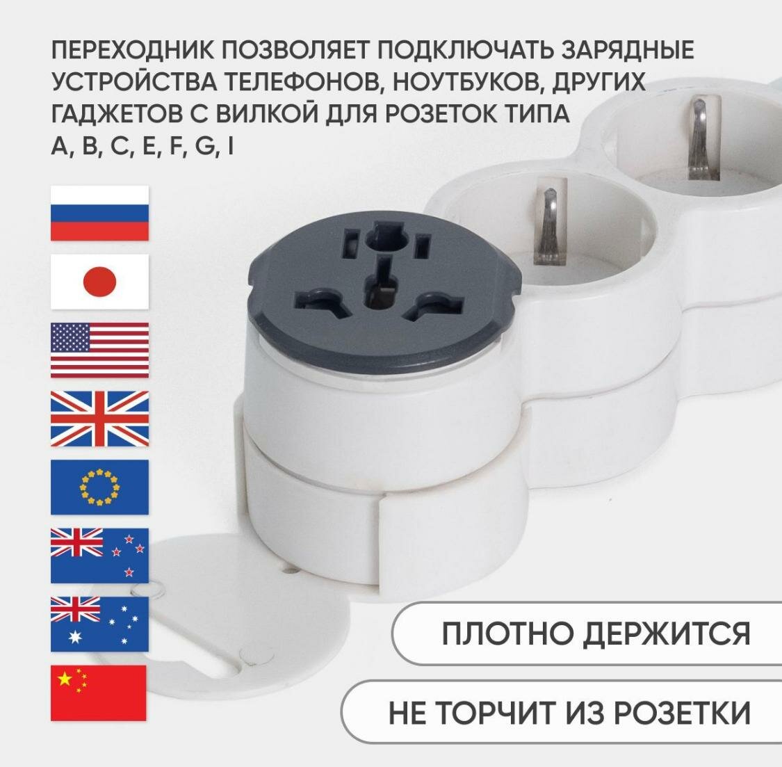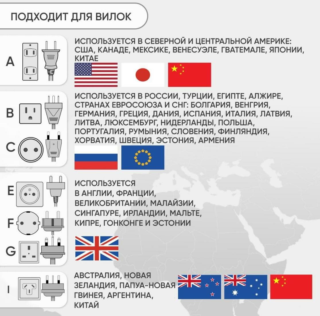 | Дополнительная информация | типы входной вилки: A, B, C, E, F, G, I; типы розеток: тип F (евророзетка); рабочая частота: 50 Гц; материал корпуса: ABS пластик |