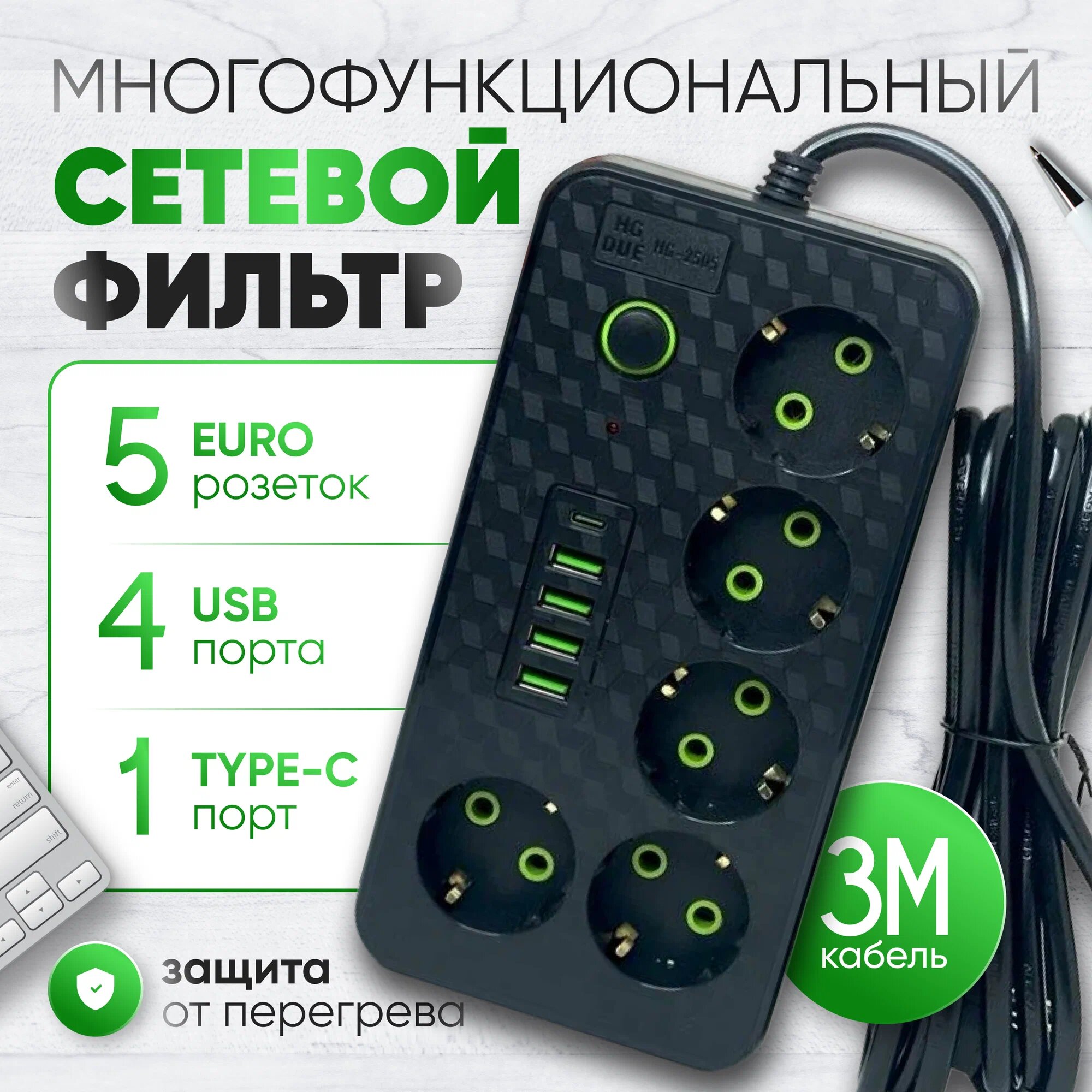 Купить Сетевой фильтр с 5 гнездами и 4 USB 1 Type-C, удлинитель бытовой 3 метра