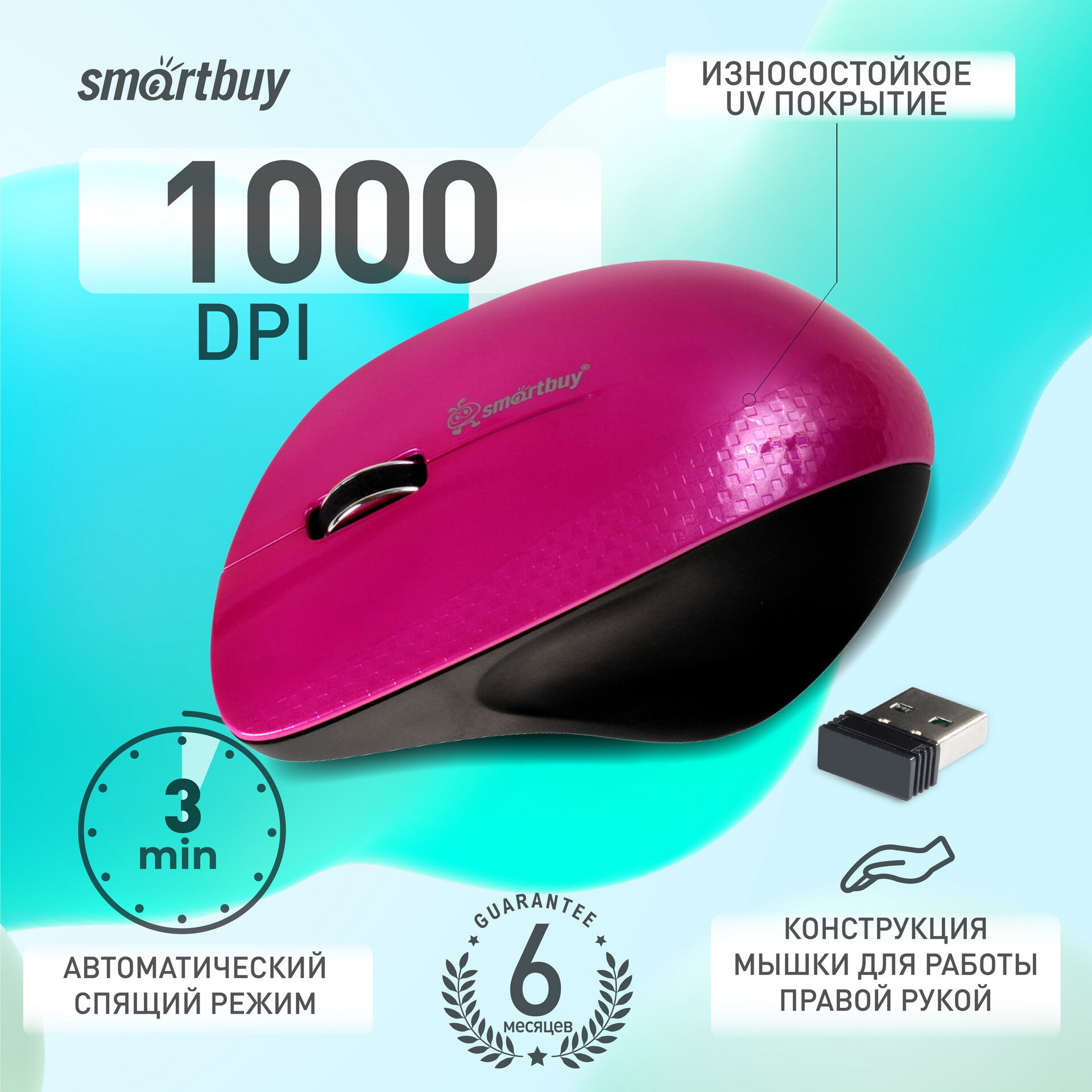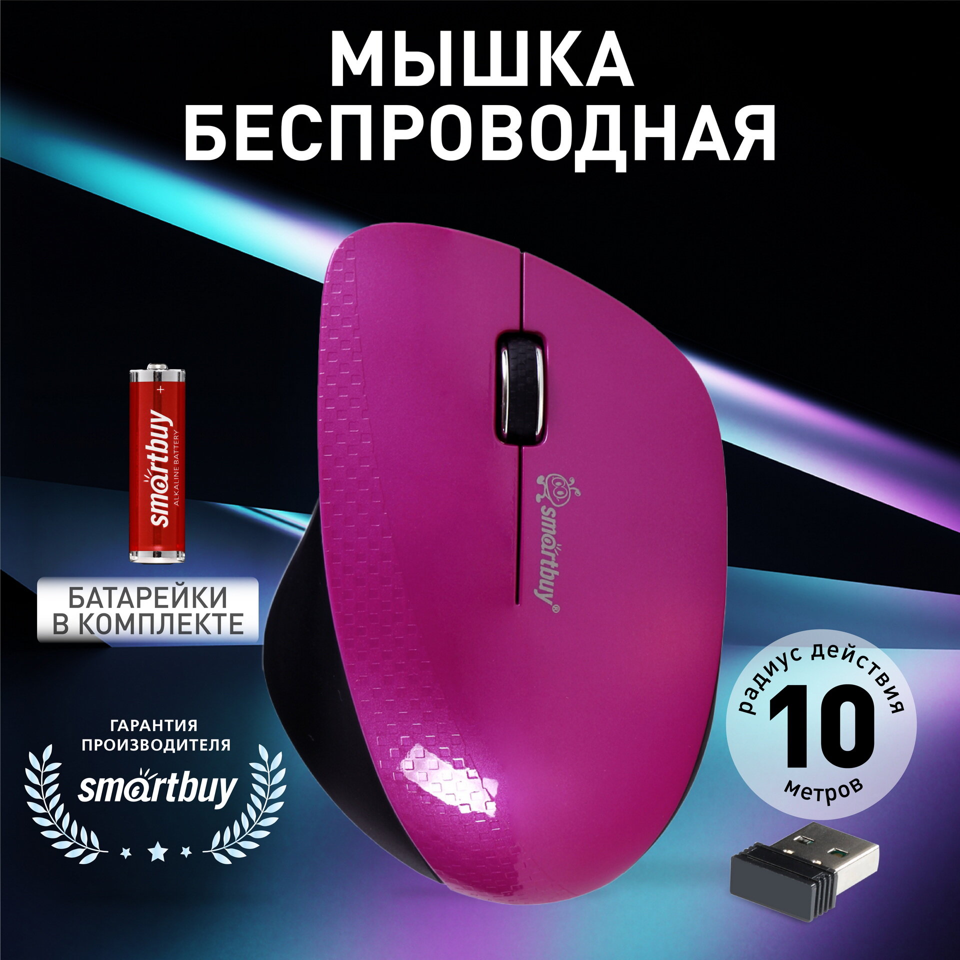 Мышь беспроводная Smartbuy 309AG USB/DPI 1000/3 кнопки/1AA (SBM-309AG-P) фиолет/черный