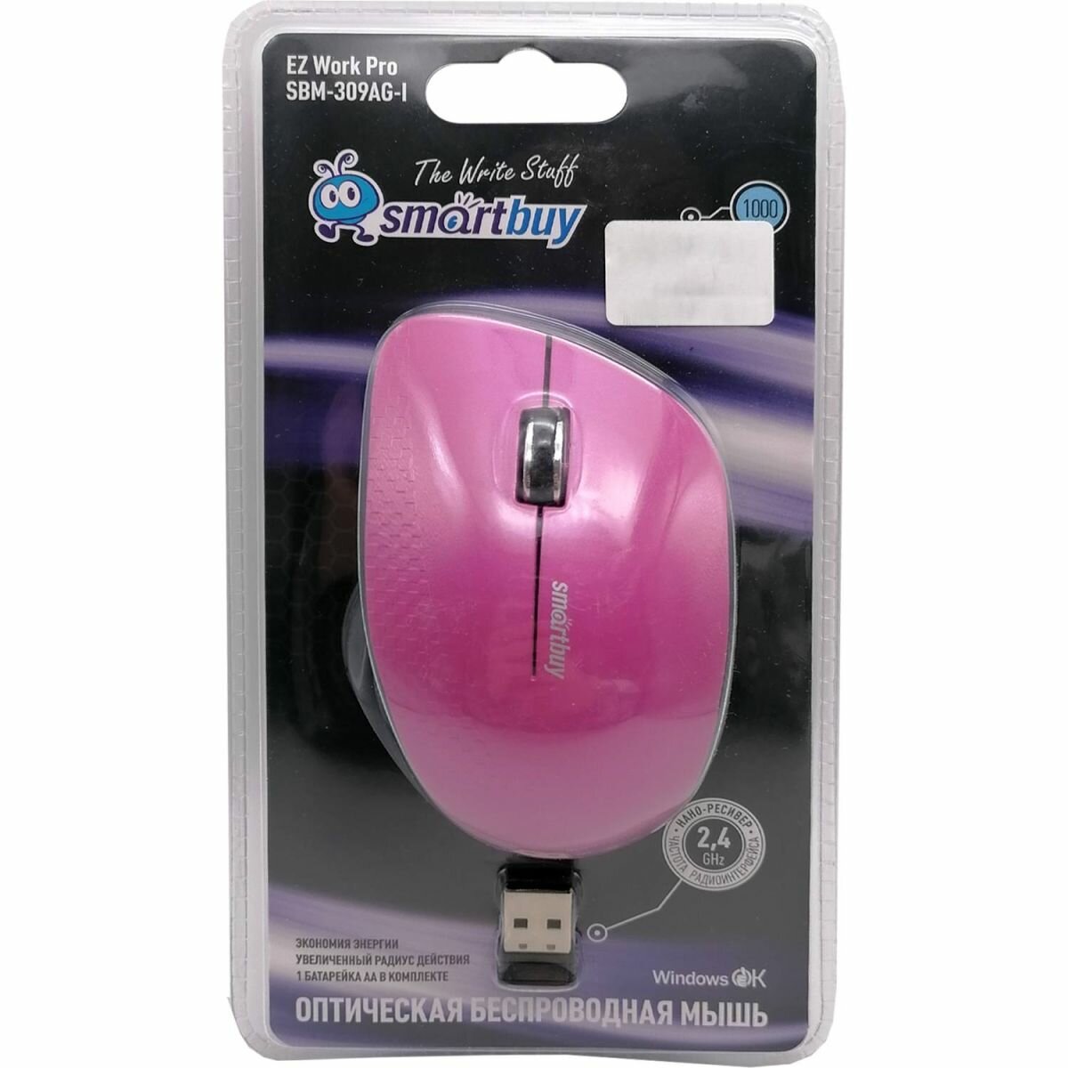 Мышь беспроводная Smartbuy 309AG USB/DPI 1000/3 кнопки/1AA фиолет/черный (SBM-309AG-P)