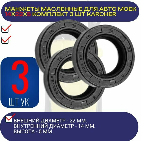 Манжеты масляные 14X22X5 3ШТ армированные, уплотнения, запчасти, сальники для KARCHER STIHL CHAMPION STAVTOOL и другие мойки. интересное: