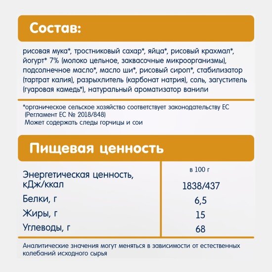 | Состав | рисовая мука*, тростниковый сахар*, яйца*, рисовый крахмал*, йогурт* 7% (молоко цельное, заквасочные микроорганизмы), подсолнечное масло*, масло ши*, рисовый сироп*, стабилизатор (тартрат калия), разрыхлитель (карбонат натрия), соль, загуститель (гуаровая камедь*), натуральный ароматизатор ванили. *органическое сельское хозяйство соответствует законодательству ЕС (Регламент ЕС №2018/848). Может содержать следы горчицы и сои |