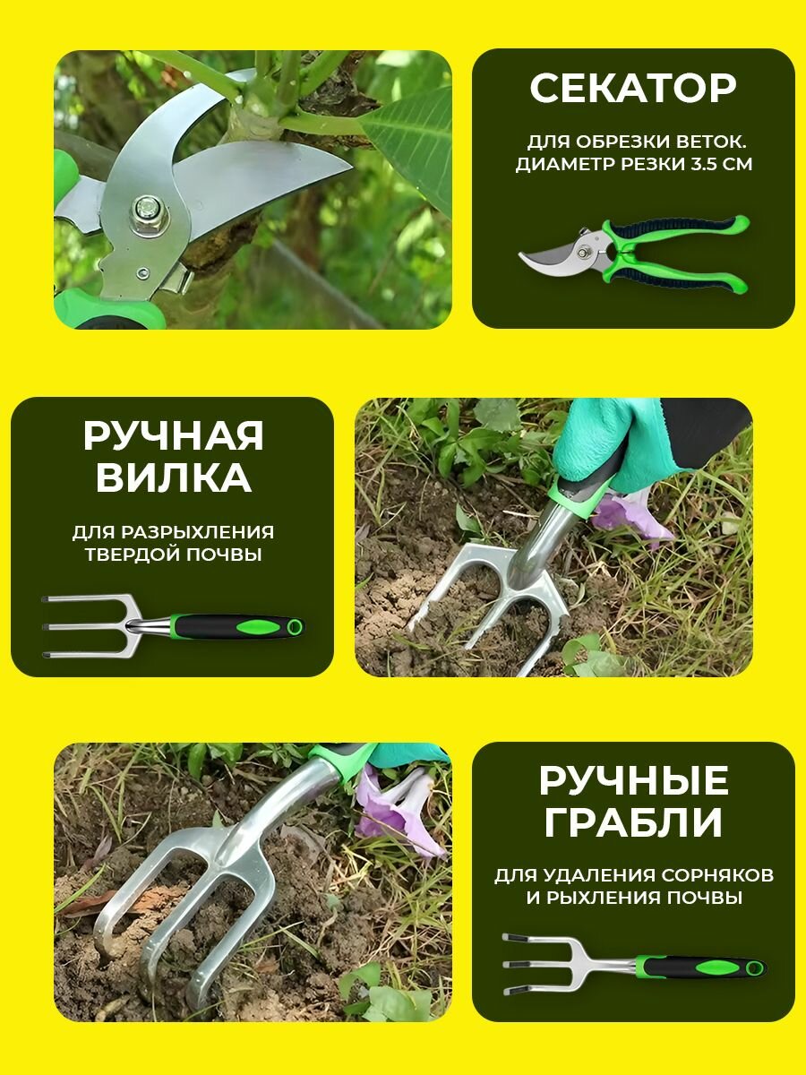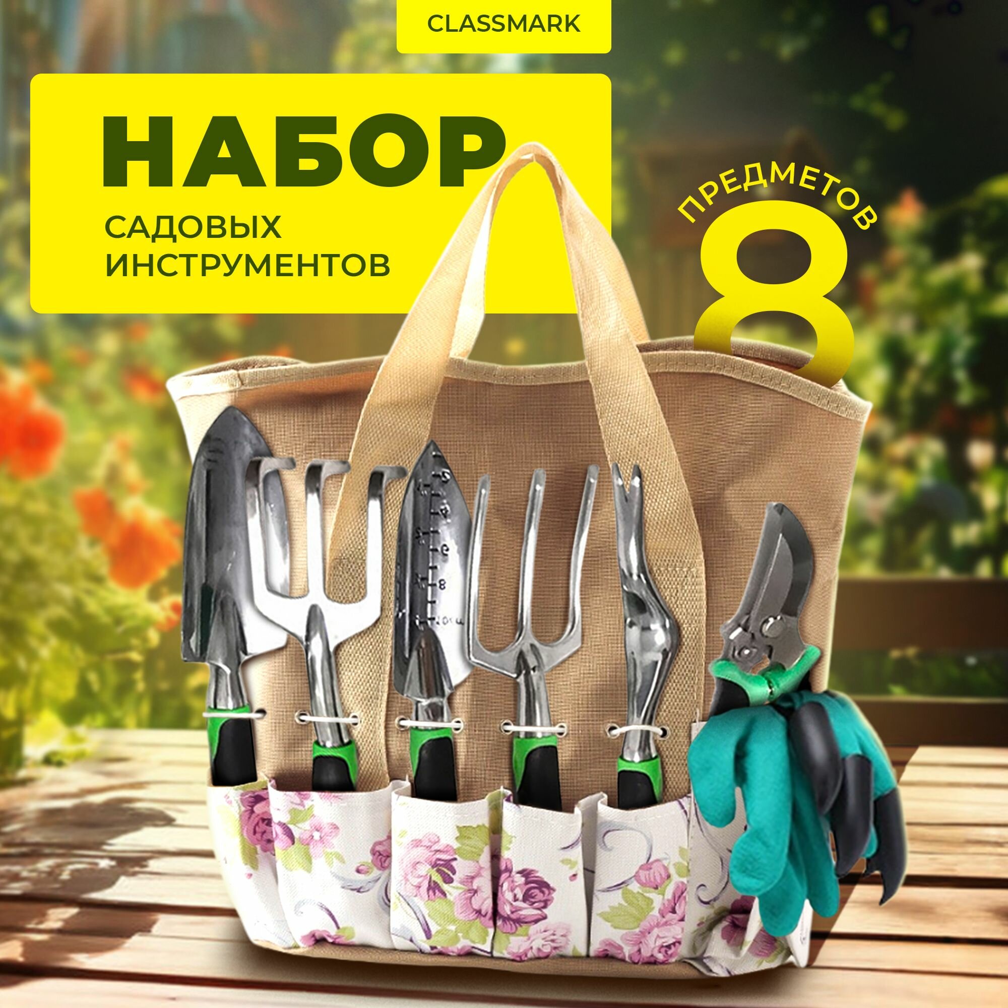 Набор садовых инструментов Classmark инструменты для сада и огорода, сумка и перчатки с когтями для копания в комплекте, секатор и ручная вилка, грабли и мерная лопатка, корнеудалитель - 8 предметов интересное: