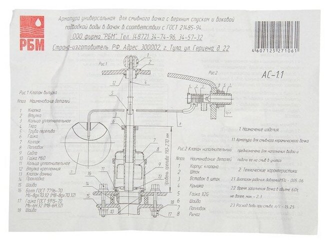 СохранитьАрматура для бачка сливная/наливная боковое подключение шток белый 1/реж универсал РБМ АС-1.1 интересное: