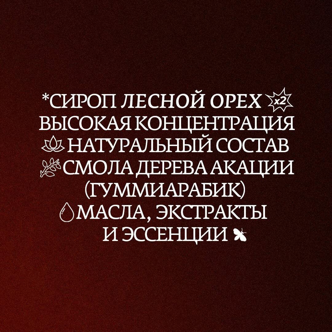| Состав | сахар; вода питьевая подготовленная; натуральные ароматизаторы; краситель натуральный сахарный колер; стабилизатор гуммиарабик (смола дерева акации); консервант сорбат калия; регулятор кислотности лимонная кислота; фундучная паста; подсластители сукралоза, экстракт стевии; экстракт черного ореха. |