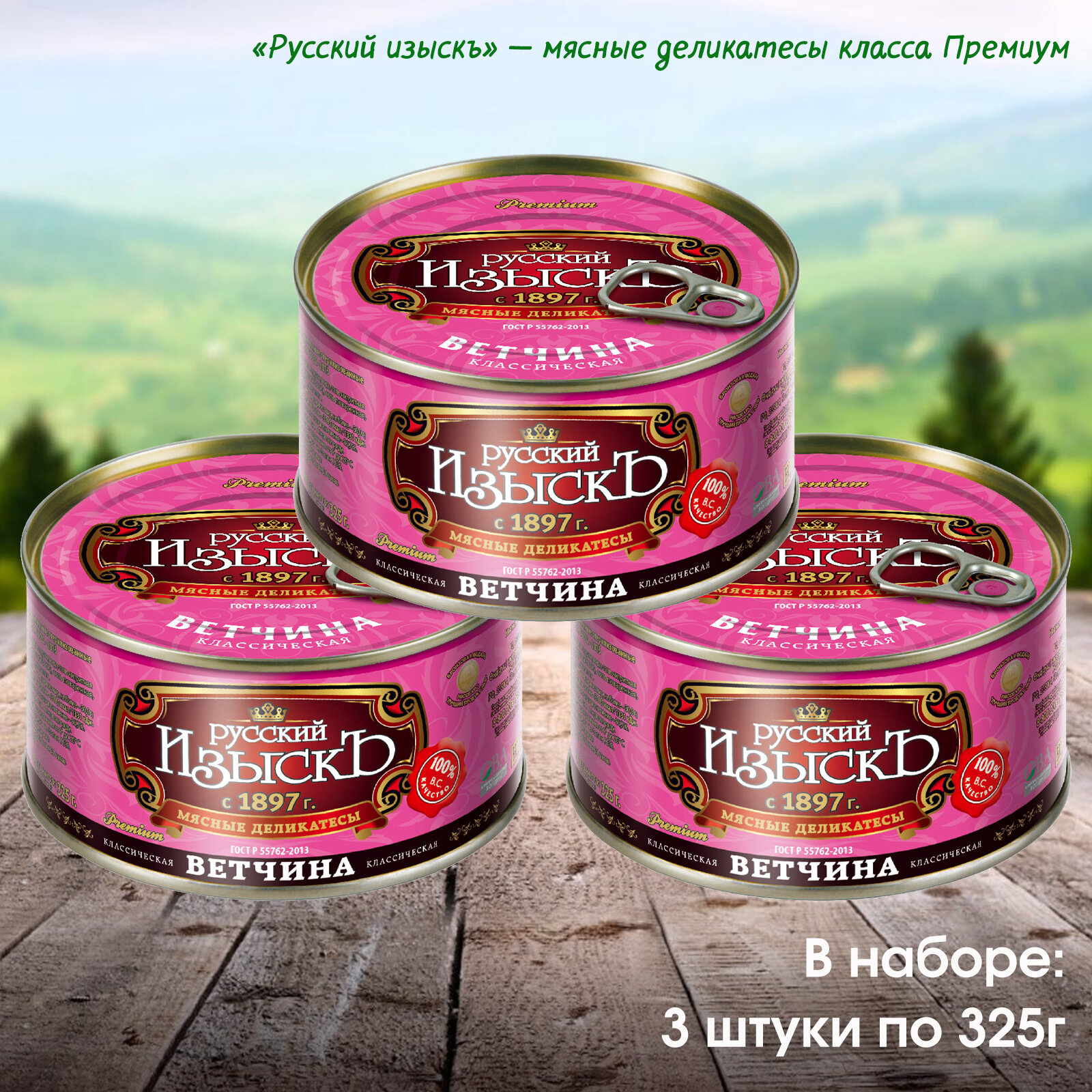 Купить Ветчина "Русский Изыскъ" высший сорт, консервы, натурально, 3 штуки по 325 грамм.