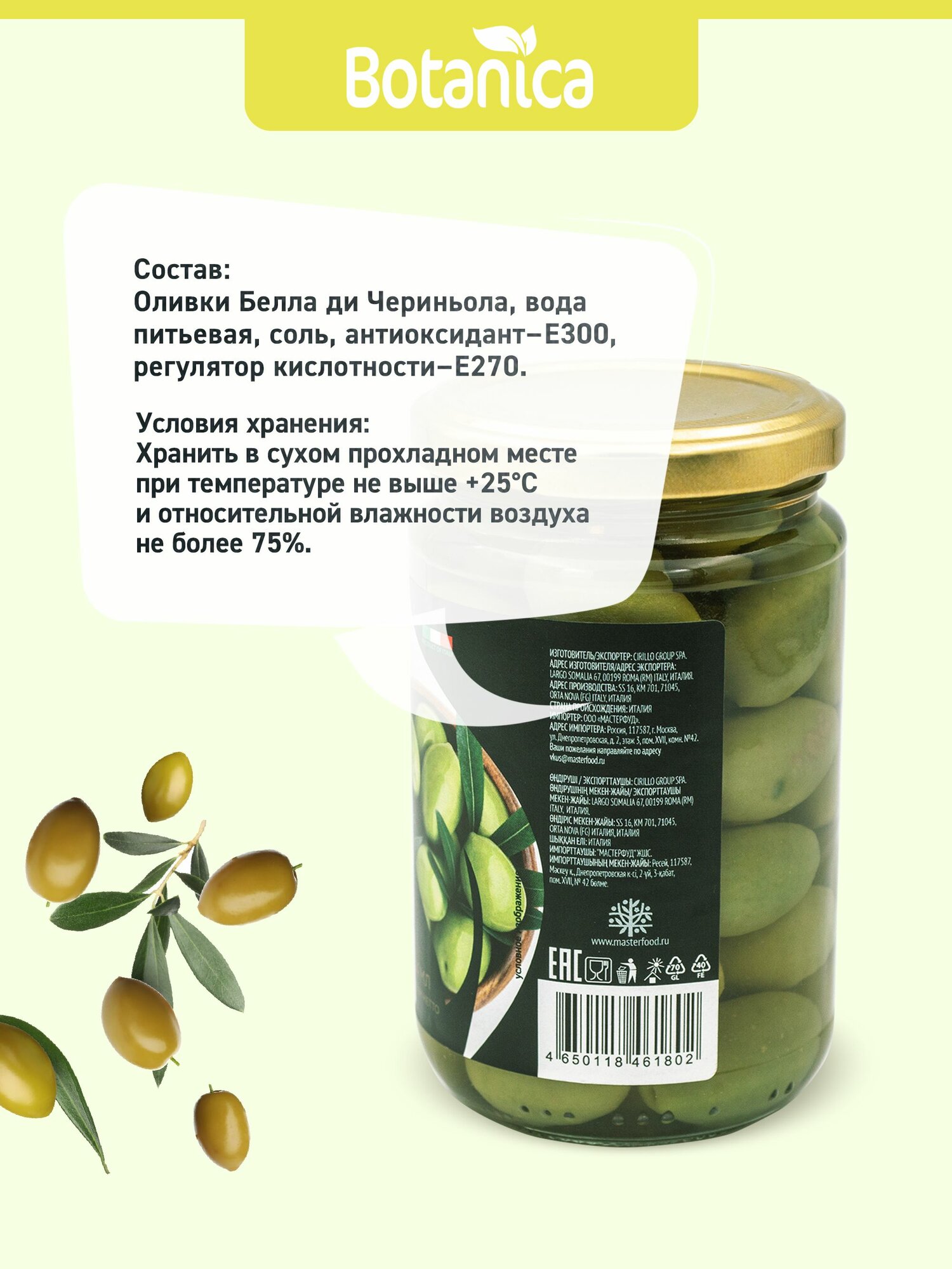 | Состав | Оливки Белла ди Чериньола, вода питьевая, соль, антиоксидант - Е300, регулятор кислотности - Е270. |