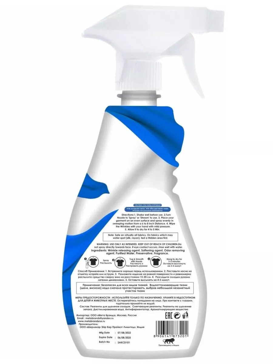 | Способ применения | 1. Встряхните хорошо перед использованием. 2. Разложите изделие на ровной поверхности и равномерно распылите средство сверху вниз на расстоянии 15-20 см. 3. Разгладьте складки руками легкими движениями. 4. Оставьте высыхать на 4-5 минут |