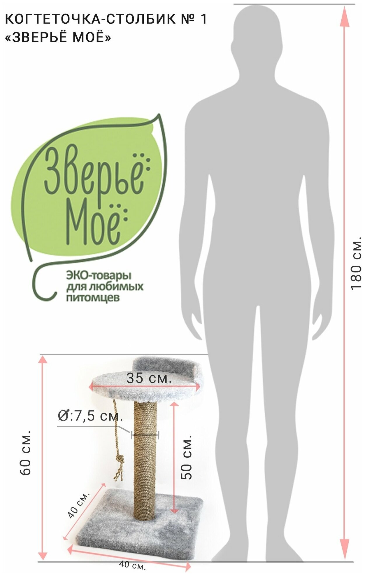 Когтеточка Зверьё моё, столбик с полкой, джутовая, с пропиткой, серебристая, с игрушкой 60x40x40 см,