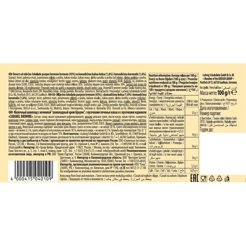 | Состав | сахар, какао масло, пальмовое масло, сухие сливки, сухое цельное молоко, какао тертое, сладкая сухая молочная сыворотка, карамель 1.1%: сахар, масло какао, пальмовое масло, сироп из глюкозы, сухое цельное молоко, масло сливочное, миндаль, лактоза, соль, натуральный ароматизатор, ароматизаторы, эмульгаторы (лецитин соевый, лецитин подсолнечный); какао порошок обезжиренный 1%, кокосовое масло, мука пшеничная, молочный жир, эмульгатор лецитин соевый, натуральный ароматизатор, натуральный ванильный ароматизатор, пшеничный крахмал, соль морская, разрыхлители (гидрокарбонат натрия, гидрокарбонат аммония); может содержать следы арахиса, орехов и яйцо |