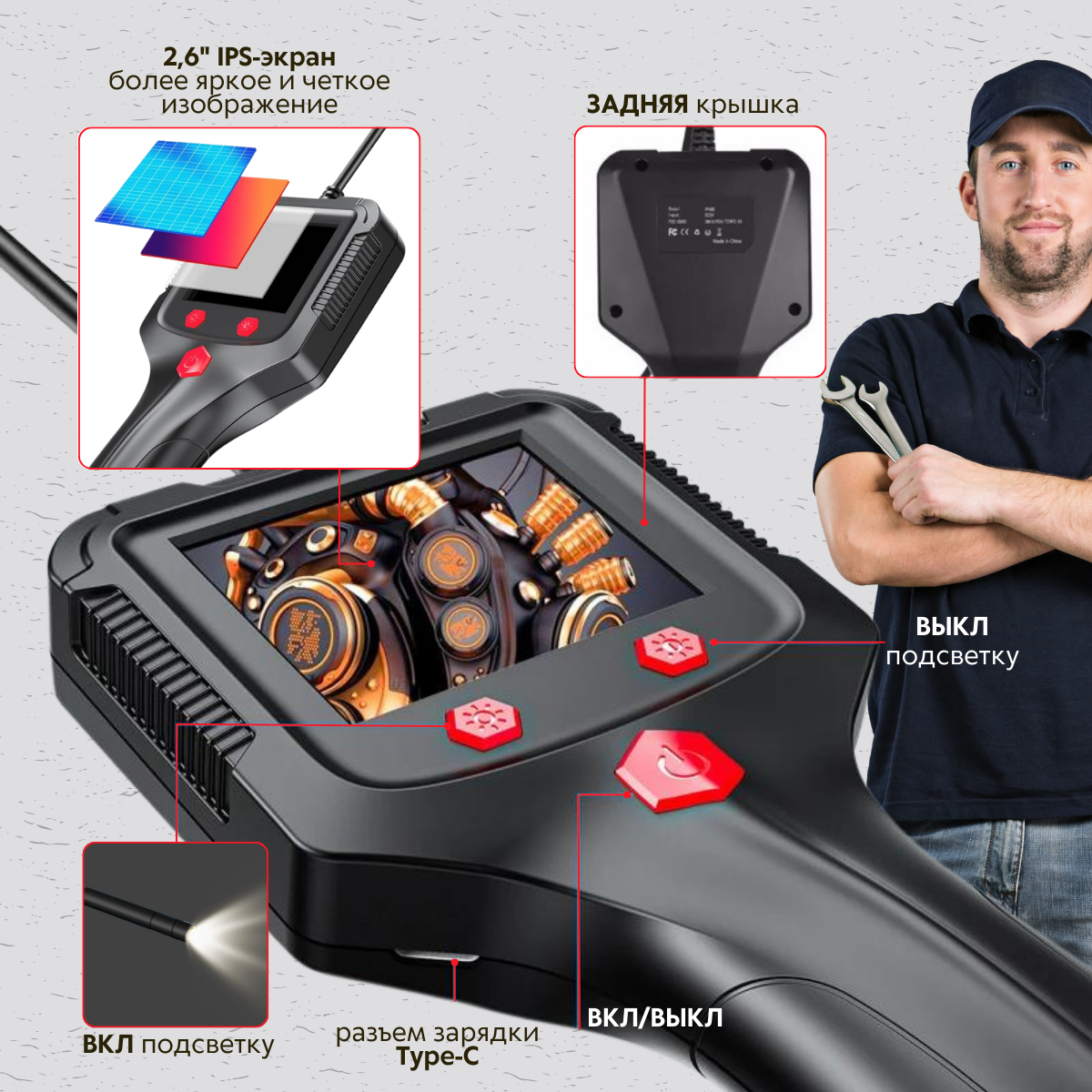| Комплектация | Эндоскоп; Объетив 8 мм; Кабель для зарядки; Крюк; Магнит; Боковое зеркало |