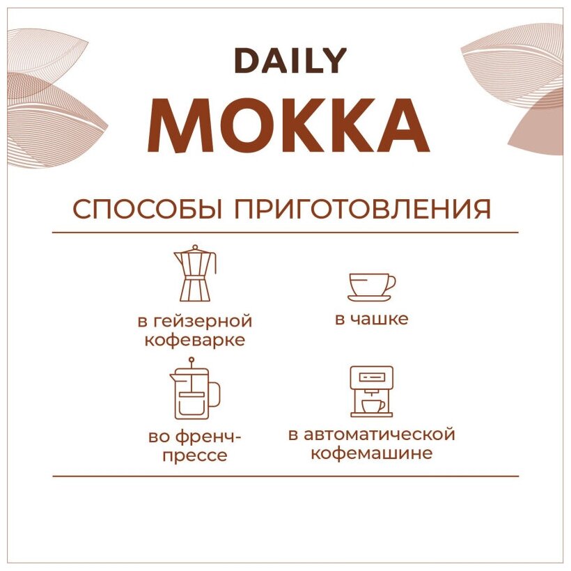 | Дополнительная информация | Способы приготовления: френч-пресс, турка, кемекс, гейзерная кофеварка, капельная кофеварка, кофемашина. |