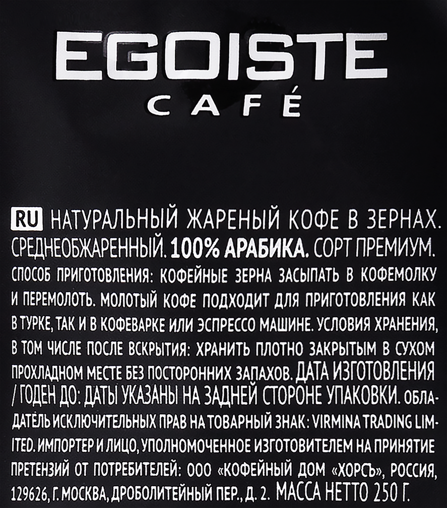 Купить Кофе в зернах Egoiste Noir, 250 г