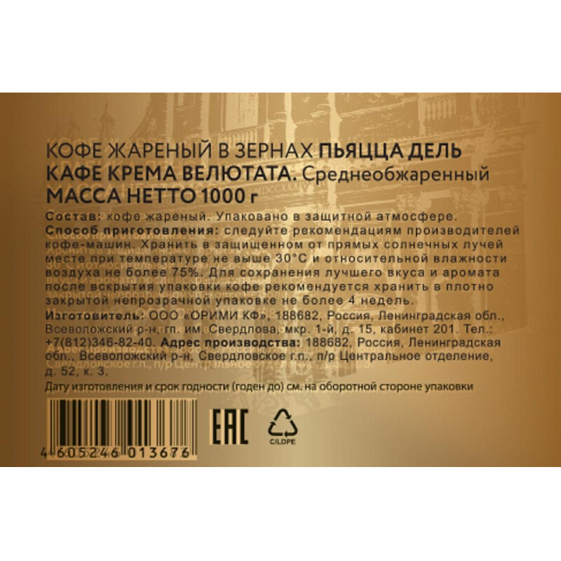 Купить Кофе в зернах PIAZZA DEL CAFFE Crema Vellutata, средняя обжарка, 100% Робуста, 1 кг