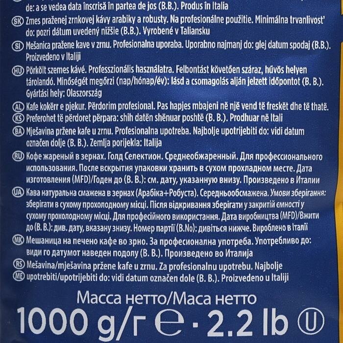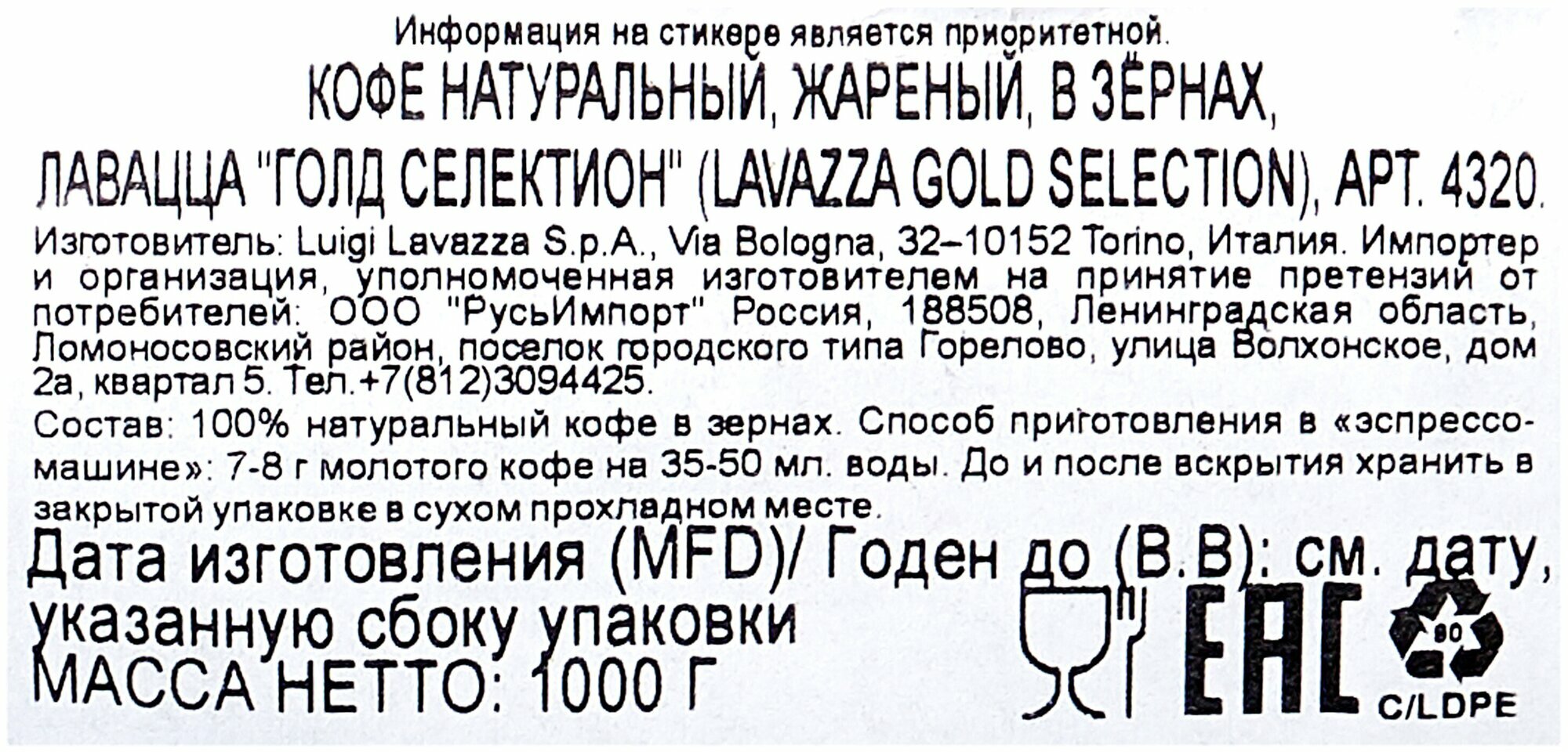 Кофе в зернах Lavazza Gold Selection 1000 г, 70% арабика 30% робуста, выраженная смесь с изысканным вкусом, из Финляндии