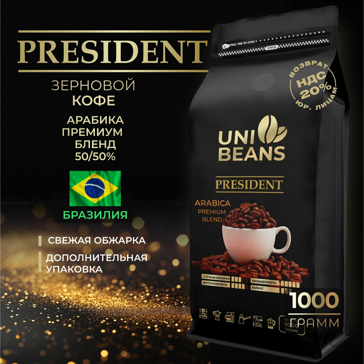 Кофе в зернах UNIBEANS PRESIDENT, 1 кг, Арабика и Робуста, свежая обжарка интересное: